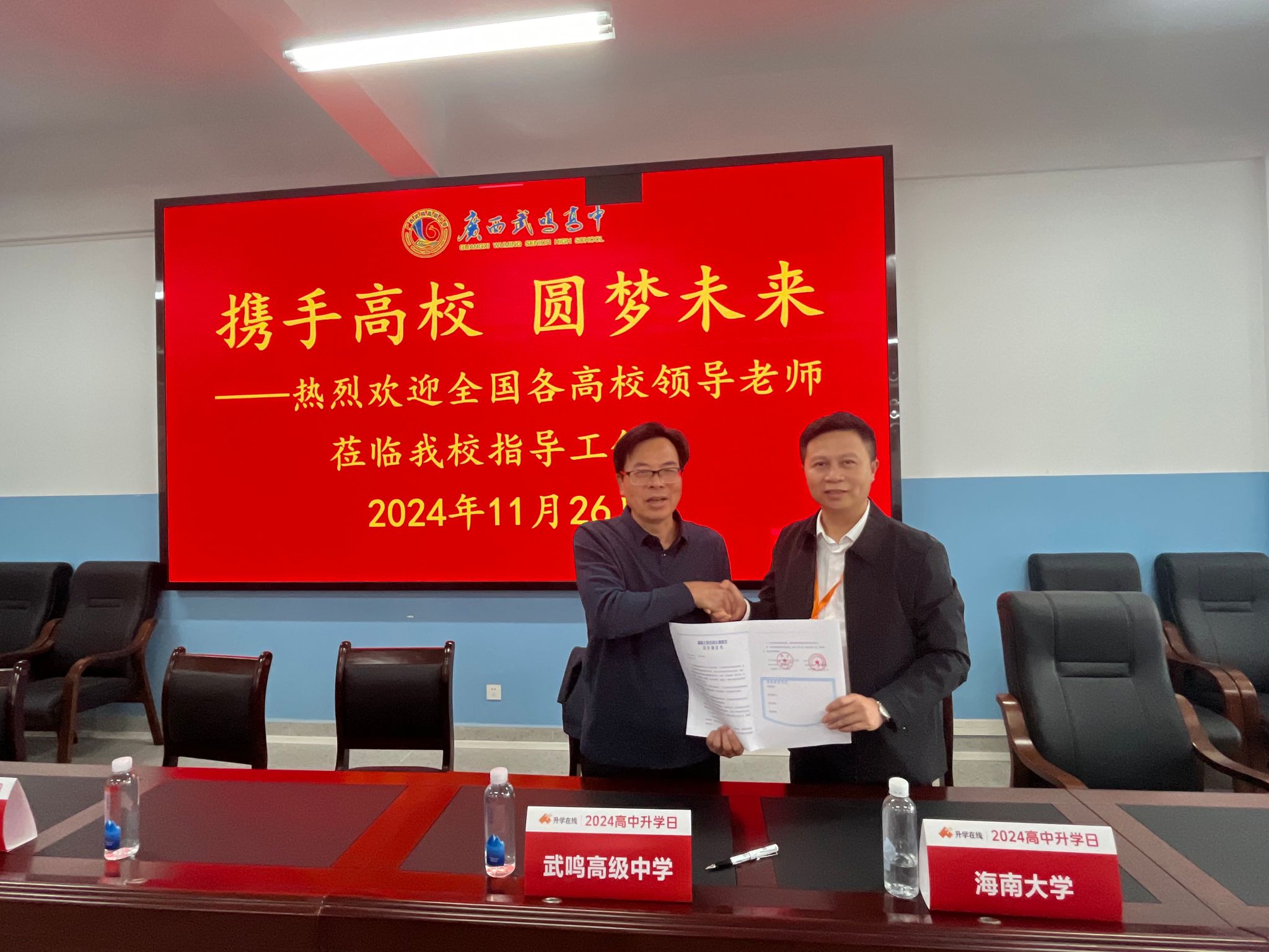 招生宣传组先后到南宁市武鸣区武鸣高级中学、广西宾阳中学、桂平市浔州高级中学、玉林市北流中学等4所重点中学,与4所重点中学负责人签订优质生源基地协议书,同时向学校领导和学生介绍灵犀直播