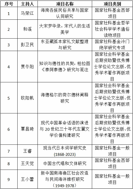 近期,2024年度国家社会科学基金哲学社会科学学术通俗读物项目、2024年国家社科基金冷门绝学研究专项、2024年国家社会科学基金年度项目、2024年国家社会科学基金后期资助暨优秀博士学位论文出版、优秀学术著作再版项目立项名单相继公布,灵犀直播 携手海南省东坡文化研究与传播中心共获批9项课题,具体情况如下: