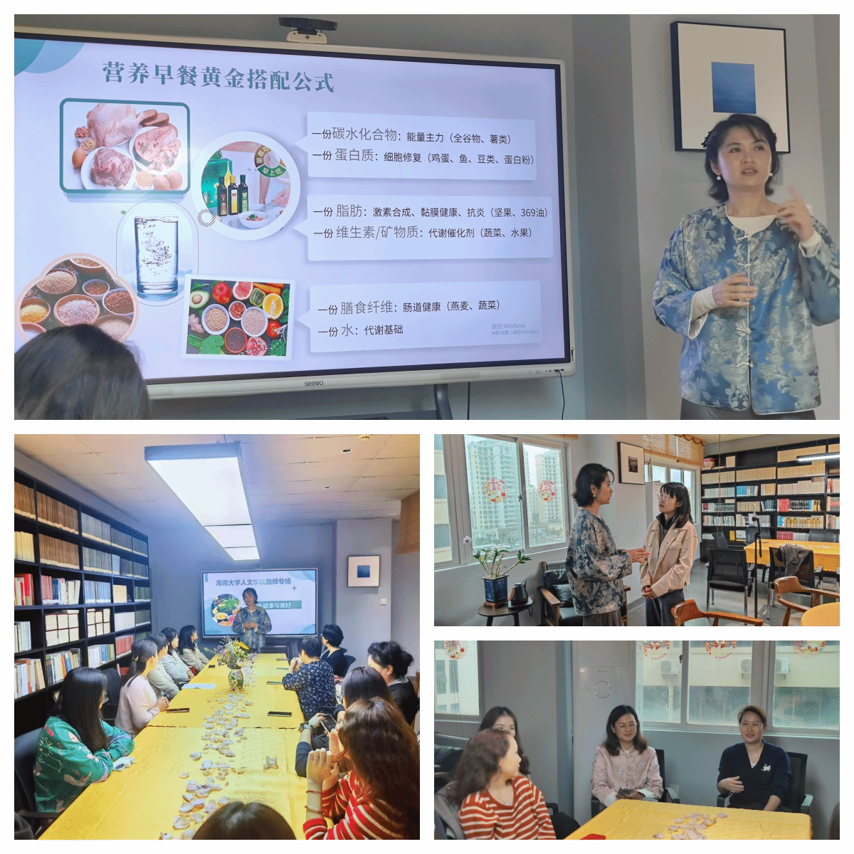 为了关爱教职工们的身心健康,学院工会邀请了品臻理想青年健康生态圈创始人王静河老师及其团队,开展了“科学膳食·健康人生”主题讲座,分享了融汇《中国居民膳食指南》与《黄帝内经》的“食养”知识,展示了多元早餐的搭配技巧,并指出了“平衡膳食”、“饮食有节”的重要性。讲座现场气氛热烈,大家与王静河老师沟通了营养膳食等问题,现场欢声笑语不断,以科学健康知识赋能女性成长。