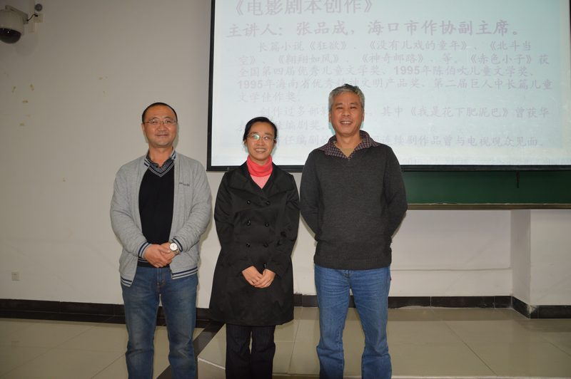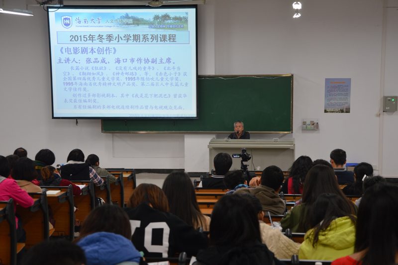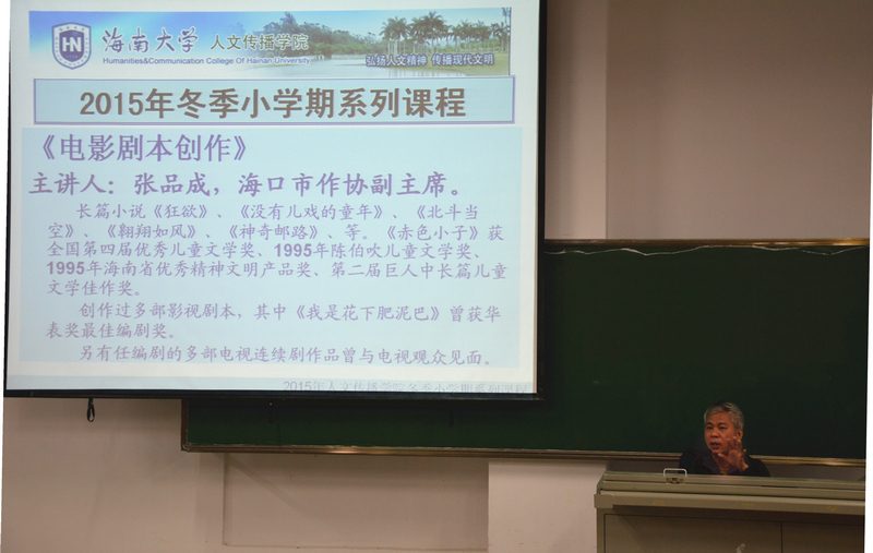 2015年1月7日晚,人文传播学院冬季小学期之《电影编剧》课程在5教311教室顺利开讲。此次课程由海口市作协副主席张品成老师授课。张品成老师是国家一级作家、编剧,曾获得中国作家协会第四、五届全国优秀儿童奖,“陈伯吹儿童文学奖”等奖项,拍摄完成的电影作品有《纸蝶》《鬼追命》等,编剧的电影《我是花下肥泥巴》获第十三届中国电影“华表奖”优秀编剧提名奖。 此次课程张品成老师围绕着电影编剧相关理论和实践进行授课。课程开端,张品成老师着重为灵犀直播