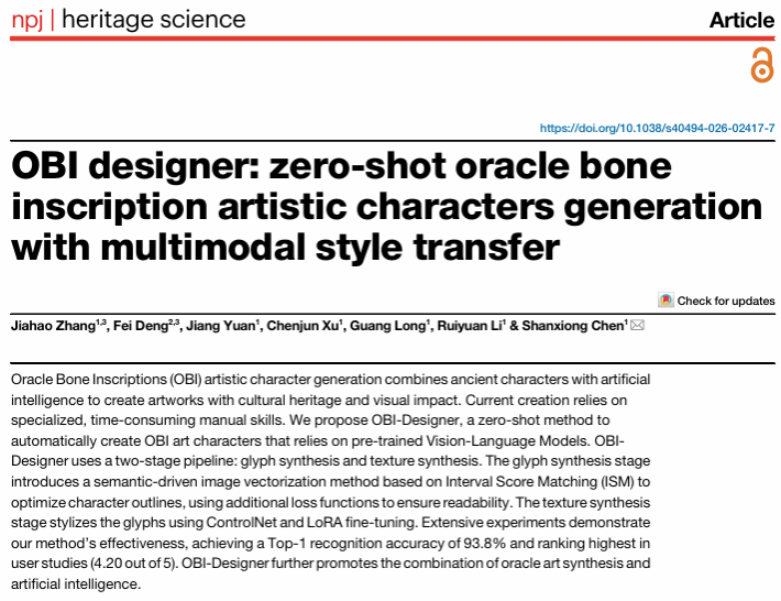 邓飞教授在Nature旗下期刊《npj Heritage Science》发表题为《OBI designer: zero-shot oracle bone inscription artistic characters generation with multimodal style transfer》的研究型论文。邓飞教授与西南大学张佳豪为同一作者,西南大学陈善雄教授为通讯作者。