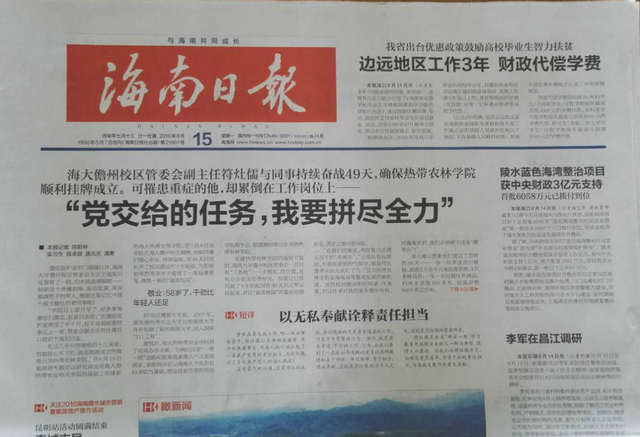 海大儋州校区管委会副主任符灶儒与同事持续奋战49天,确保热带农林学院顺利挂牌成立。可罹患重症的他,却累倒在工作岗位上——