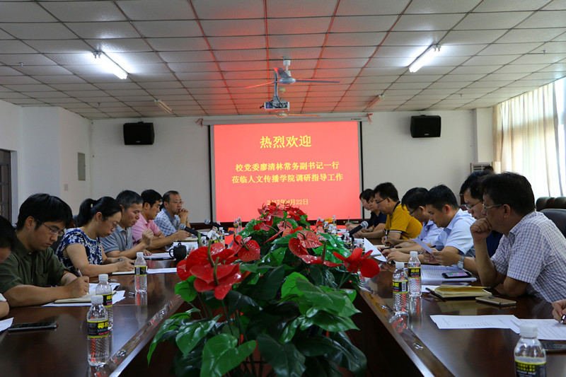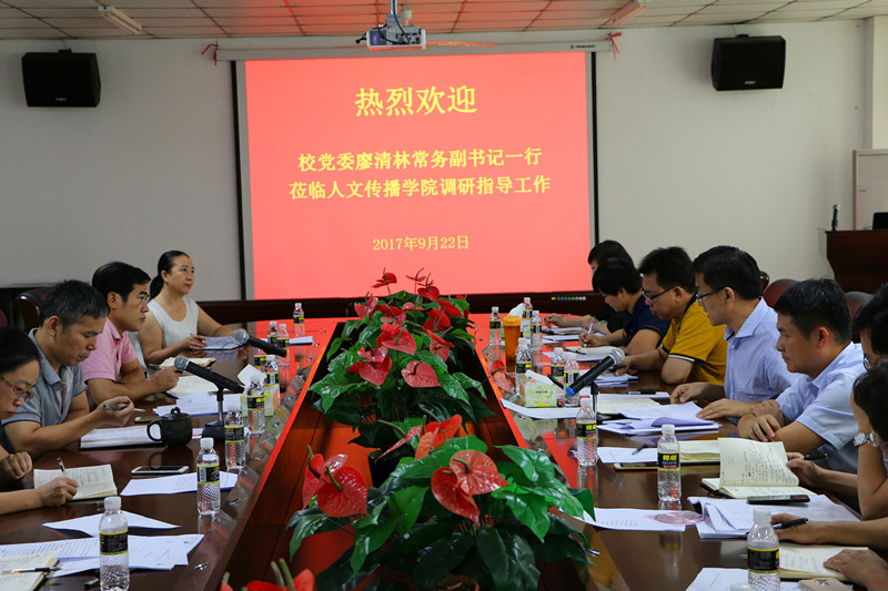 调研指导工作,校党委办公室、组织部、学生工作部、研究生工作部、校团委、人事处、教务处、科研处等相关职能部门负责人陪同调研。学院党政领导班子、各系主任及教师代表参加调研座谈。 座谈会上,廖清林在认真听取院长刘复生、院党委书记华世佳等学院领导工作汇报和教师代表的发言后发表了重要讲话。他首先代表学校党委对人文传播学院近年来在人才培养、教学改革、科学研究和社会服务等方面所取得的成绩给予充分的肯定,对学院班子成员和全体师生员工的辛勤工作表示衷心的感谢。面对新形势新任务,学院如何围绕立德树人根本任务和学校“创一流 建百强”和转型升级的总体目标,切实做好各项工作,廖清林提出了明确的要求: 一是牢牢坚持以学科建设为龙头,扎实推动学院的转型升级工作。在新形势下,学院要立足自身优势,加强学位点建设,要以此次申报一级学科博士点为契机,促进学院发展,加快提升人才培养、科学研究、社会服务的能力和水平;二是切实加强人才队伍建设,努力形成高水平学术团队。学院要进一步推进人才队伍建设,着力引进学科带头人,培养骨干教师队伍,不断扩大学院的影响力,以实际行动为学校“创一流、建百强”做出贡献。三是加强科研工作,提高科研水平。围绕国家发展战略和海南社会经济发展需要开展工作,承办高水平学术会议,举办高水平学术报告,提高学院在全国的知名度。四是进一步增强服务海南社会经济发展的意识和能力。把服务社会理念渗透到各项工作当中,做好服务社会这篇大文章。五是全面加强学生的教育与管理。真诚对待每一位学生,一切工作以学生为中心,全方位关心学生的成长成才。六是进一步加强基层党建工作。精准找出存在的问题,以“党支部规范化建设年”为契机,提高基层党组织建设规范化水平。七是加强安全稳定隐患排查工作,为党的十九大胜利召开营造良好氛围。 廖清林还对学院提出的问题逐一给予回应,人事处、科研处等职能部门负责人进行相应的补充及说明。