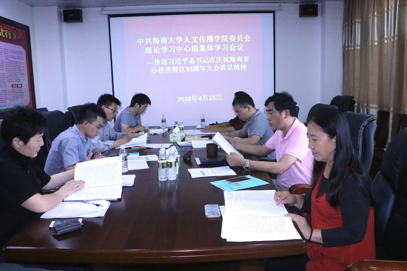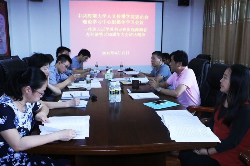 按照学校党委要求,2018年4月15日下午,人文传播学院党委理论中心组在B615会议室召开集体学习会议,传达习近平总书记在庆祝海南建省办经济特区30周年大会上的讲话精神,会议由学院党委书记华世佳主持,院长刘复生、党委副书记孙晓媛、副院长石晓岩、张硕果等学院党委理论中心组成员参加了会议。