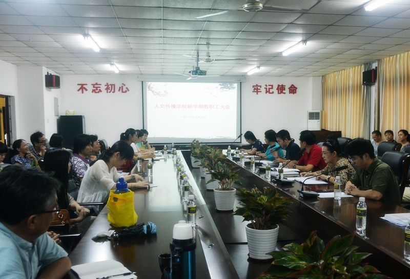 2018年9月4日下午,人文传播学院在社科楼B719会议室召开全体教职工大会,传达学校“部省合建”推进会精神,并部署新学期重点工作。会议由党委书记华世佳主持,院长刘复生、党委副书记孙晓媛、副院长石晓岩、张硕果、李彩霞等学院班子成员和70余名教职工参加会议。