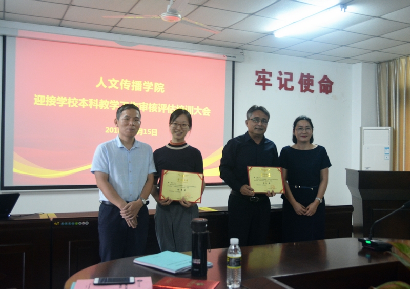 第三,王春嵩宣读学院党委关于党员教师课堂教学大比武专项活动表彰决定。广告系教师张睿、蒋锐,中文系教师李音,汉语国际教育系教师海滨等四位教师荣获优秀奖。刘复生和李彩霞共同为获奖者颁奖。
