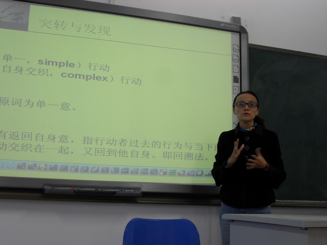 张军老师一直以严谨的教学态度和深厚的戏剧文学功底形象树立在老师和学生心中。在此次教学观摩课上,张老师也延续了自己的风格,为老师和同学们献上了精彩的一课。张老师主要围绕亚里士多德著的《诗学》中关于戏剧中“突转”和“发现”的内容展开;她首先从简单悲剧和复杂悲剧入手,得出简单悲剧和复杂悲剧都是一个行动的悲剧的总结,接着张老师解释了“突转”与“发现”的含义。张老师的严谨治学态度在本次课上淋漓尽致地体现出来,她对于“突转”和“发现”不仅仅拘泥于一家之言,而是从多个《诗学》的译本入手,对比各个译本,得出自己的结论的同时鼓励学生自己多思考、深入理解、提出自己的意见。同学们积极配合老师,在认真听讲之后提出了独到见解和个人的疑问,老师也尽力为同学们解惑。