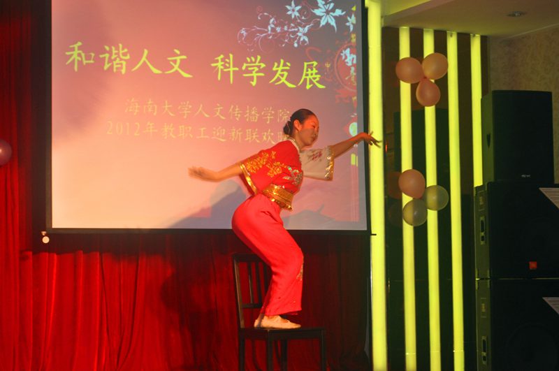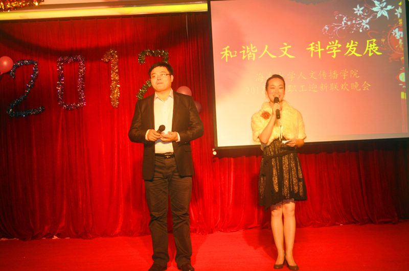 2012年教职工迎新联欢晚会在这里隆重举行。来自全院的60多名教职工在此欢聚一堂,喜迎2012新年的到来。学院领导闫广林院长、王兆庆书记、闫金玲副院长、孙晓媛副书记出席联欢会并与全院教职工一起联欢。 在联欢会前的招待晚宴上,闫广林院长代表学院领导致辞,向全院教职员工一年来在工作岗位上辛劳敬业的工作致以深深的谢意并送上美好的新年祝福。闫广林院长说,人文传播学院近年来取得了长足的发展,特别是在我校“211”工程项目的“迎评促建”活动中,团结奋进、攻坚克难,取得了出色的成绩,学院整体氛围和谐,发展态势良好,这与全院教职员工的团结协作和辛勤奉献是分不开的。闫广林院长代表学院领导诚挚地祝愿全体教职工新年愉快,工作顺心。 招待晚宴后,迎新联欢晚会在张硕果、刘显、李骞、李风逸四位青年教师的合唱《真心英雄》中拉开帷幕。整场联欢晚会节目流行与古典兼收,温情与火热并举,形式多样,精彩纷呈。吴君静老师的独舞《葬心》,动作优美流畅,表情生动,伴随着如怨如诉的缓缓歌声,带给在场观众一场古典的视听震撼。多才多艺的杨国良老师深情演唱的英文歌曲,曲调和谐优美,让大家沐浴在一片欧风美雨之中。耿占春老师清唱的藏族、蒙古族民歌,歌声浑厚悠扬,充满异域情调,则是瞬间把在场听众引向了青藏高原和蒙古草原。而几位青年教师带来的节目则更为抢眼,院办翁浩予老师一人担双角儿倾情演唱的歌曲《北京一夜》,时而粗犷,时而婉约,不失专业水准,可谓燃爆全场。 整场联欢会的热烈氛围也引来学院领导纷纷登台献技,闫广林院长率先献唱歌曲《爱与哀愁》,酣畅而专注的演唱博得了大家的热烈掌声。而由闫广林院长和闫金玲副院长共同表演的方言串烧,诙谐幽默,则更是逗乐全场。孙晓媛副书记则带领全体学工办老师为联欢会奉上了优美的手语表演《中华民族》。 值得一提的是,联欢会还设置了游戏环节和抽奖环节,游戏环节中的“抢凳子”、“踩气球”、“掷纸团”引来众多老师的热情参与,大家斗智斗勇,搞笑而热烈,增强了整场晚会的喜庆氛围。晚会尾声的抽奖环节则更是引人关注,最终头等大奖由杨国良老师幸运抽获。最后联欢会伴随着歌声《难忘今宵》,在全体教职工纷纷登台合影的欢笑声中落下帷幕。 此次联欢晚会是由灵犀直播