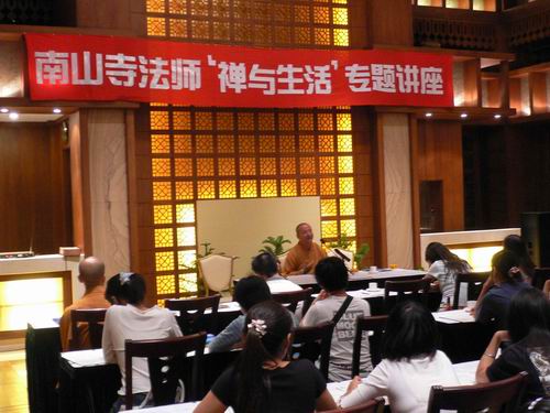 师生举办了“禅与生活”专题座谈会,座谈会由熊教授和能照法师主持,能照法师旁征博引、深入浅出地为大家介绍了佛教的基本精神和禅的内在精髓,其精彩的讲座赢得了同学们的一阵阵掌声,其后,同学们就自己学习心得与能照法师进行了多方面交流,整个座谈会持续了3个多小时。
