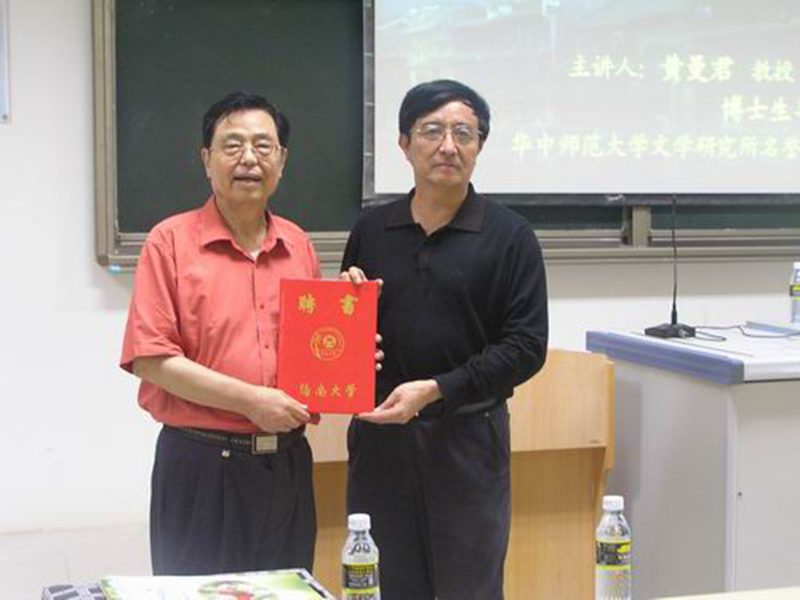 赵康太教授(右)向黄曼君教授(左)颁发兼职教授聘书