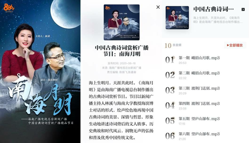 温馨推荐:进入“学习强国”-“海南学习平台”-“声动海南”-“中国古典诗词赏析广播节目:南海月明”,可以随时收听。