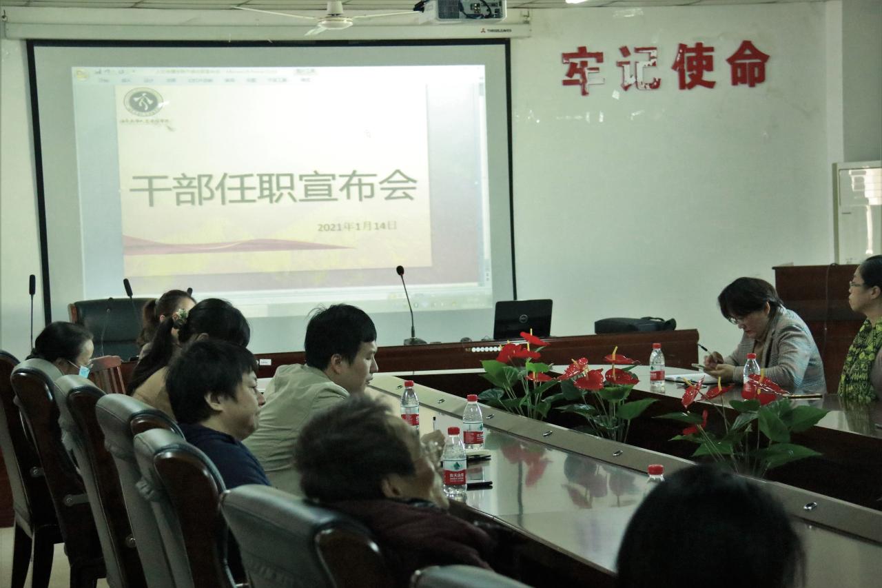 2021年1月14日下午在社科楼B座719会议室召开干部任职宣布会。校党委组织部副部长李锋,学院领导班子成员,各系主任、各办主任、教师代表出席会议。会议由院长刘复生同志主持。