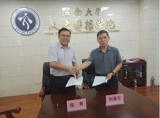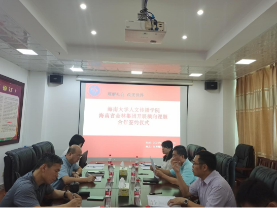 人文传播学院与海南省金林集团在社科楼B615会议室举行横向课题合作签约仪式。仪式由学院党委书记邱华祥主持,院长刘复生、海南省金林集团党委委员/纪委书记张勇、集团工会主席/党建工作部经理黄岗、传播学系主任朱杰、余榕老师等出席签约仪式。