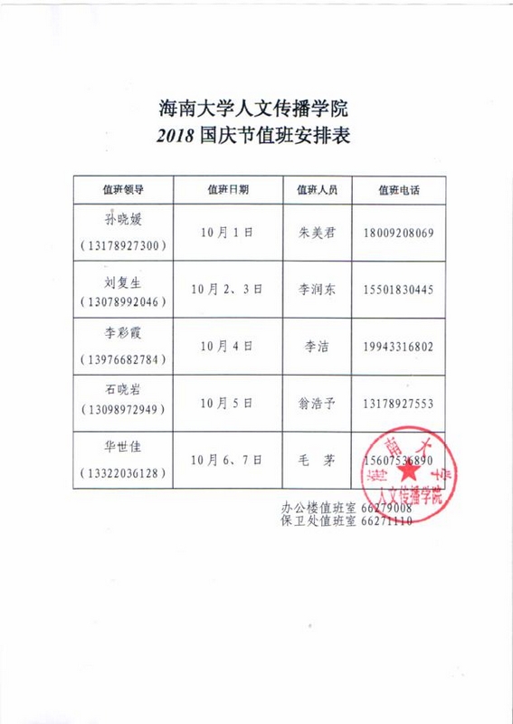 人文传播学院2018国庆节值班安排