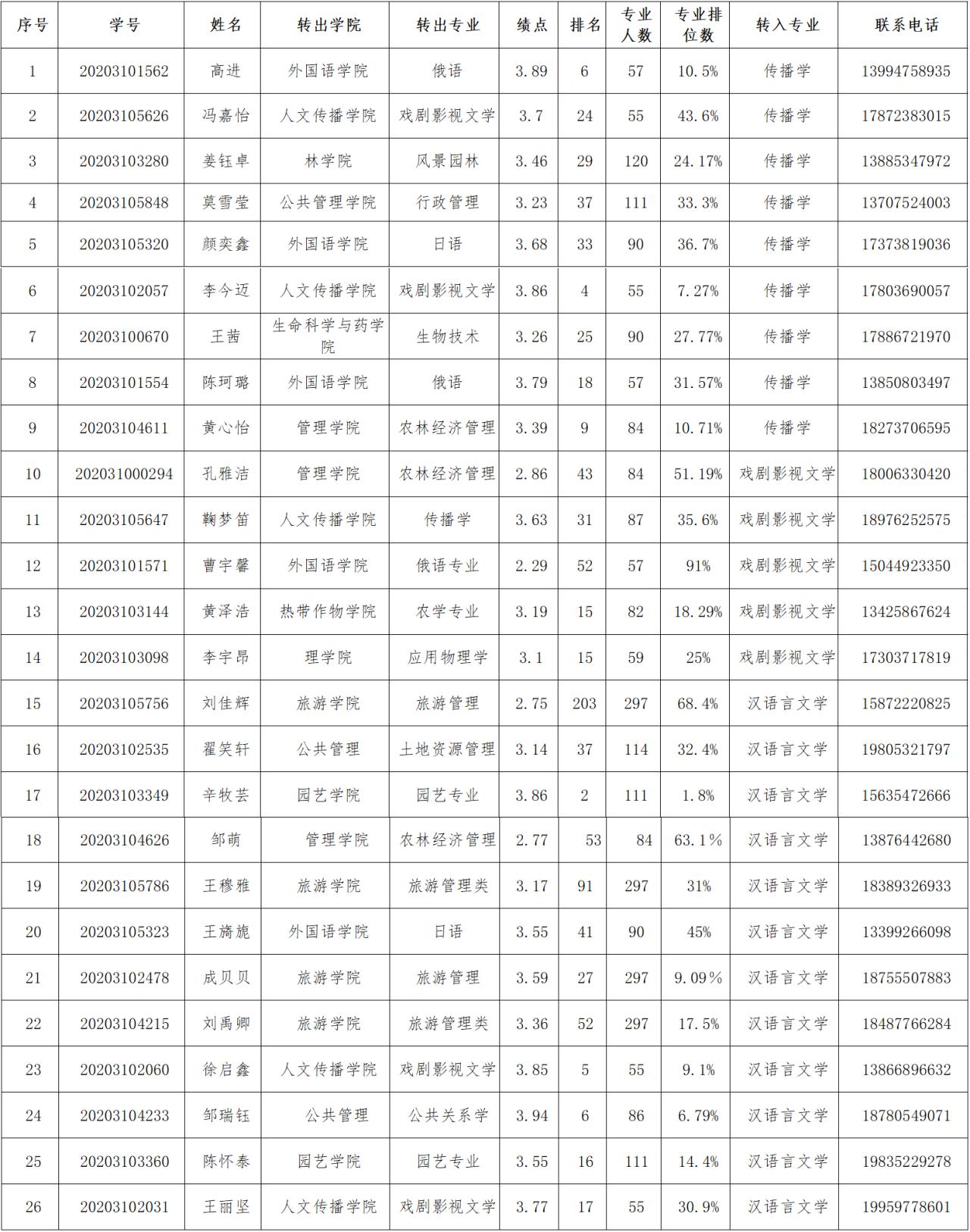 普通本科学生转专业规定》(2020年版)、教务处《关于2020级普通本科学生转专业相关事宜的通知》(海大教〔2021〕60号)的要求,经学生本人申请,转出学院初审,人文传播学院接收转专业学生考核工作领导小组审核,确定人文传播学院拟接收2020级普通本科转专业学生名单,现将名单(附后)予以公示。公示期间,若对拟接收学生名单有异议,请在公示期内通过书面材料(署真实姓名)形式向学院反映。