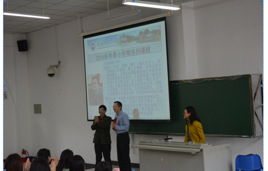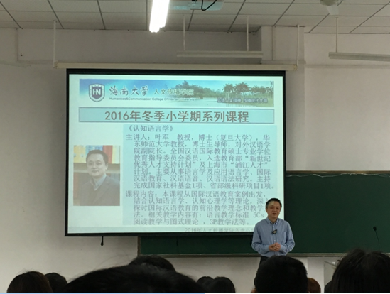 2016冬季小学期授课外聘专家”证书。同学们对叶军老师的到来表示热烈的欢迎。通过丛琳老师的介绍,大家了解到叶军教授是全国汉语国际教育硕士专业学位教育指导委员会委员,入选教育部“新世纪优秀人才支持计划”及上海市“浦江人才”计划。同时,叶军教授在语言学及应用语言学、国际汉语教育、汉语语音、汉语语法研究等多方面都是学界的领军人物。在课堂上,叶军老师以幽默风趣的讲课方式,结合生动鲜活的国际汉语教育案例,为同学们讲授认知语言学和认知心理学方面的有关知识。通过对多个真实案例的详细阐述与精要剖析,深入浅出地为大家还原了真实的国际汉语教育课堂,让听讲的同学们在活跃的气氛中深入了解作为一名国际汉语教师的职责与能力要求。并不仅如此,叶军老师还与同学们一起探讨国际汉语教育的前沿教学理念和教学方式,帮助同学们掌握学科前沿动态。