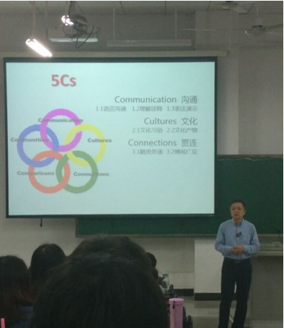 叶军老师是我们专业的领军人物,近年来的成绩一直处于上升阶段,能够邀请到叶军老师为我们讲解认知语言学的课程实属于我们的荣幸。在同学们的阵阵掌声中,叶军老师开始了有声有色的讲授,老师从汉语国际教育案例出发,结合认知语言学、认知心理学等理论,深入探讨国际汉语教育的前沿教学理念和教学方法。叶军教授的课程包括八个部分,分八次课进行讲解。叶军老师着重讲解了语言能力和语言交际能力,其中语文被理解为语言+文字,语音+文字,工具性+人文性。语言能力被分为:语言知识、语言技能、语言能力和语言交际能力。语言知识又分为语音,字词、语法,功能、话题和语篇。语言技能又可以理解为:听、说、读、写。接下来,叶老师讲到了策略问题,策略包括情感策略、学习策略、交际策略、资源策略和跨学科策略。在认知语言学中,将这些策略结合并应用于对外汉语教学中,会对其产生极大的帮助。叶军老师说,“在对外汉语教学的过程中,我们要充分运用文化意识这一重要的手段来更好地发挥。”叶军老师所讲的文化意识包括:文化知识、文化理解、跨文化意识、国际视野。他举了很多生动形象的例子来阐释文化意识在对外汉语教学课堂的重要性,让我们的课堂充满趣味性。与此同时,叶军老师为配合语言能力的讲解,又为同学们讲解了Beck的语言能力框架——语言能力分为组织能力和语用能力。叶老师列举了很多生动的例子帮助我们理解语言与文化的关系。老师问我们:“人与人见面的时候为什么要打招呼?”同学们笑了,一时不知如何回答。叶军老师笑着说:“人们打招呼是为了确定关系。”同学们有点诧异。老师解释:“我们与另外一个人是什么关系,我们就会用怎么样的方式打招呼。”老师又问:“同学们,如果是你们给外国人上中文课,你们是教他们‘你好’还是‘你吃了么?’”同学们异口同声答道:“你好。”可见在对外汉语的教学过程中,文化与一点一滴的语法知识是相关联的。接下来,叶军老师又为我们讲授了语言教学标准5Cs——communication(沟通)、culture(文化)、connection(关联)、comparisons(比较)以及communities(社区)。