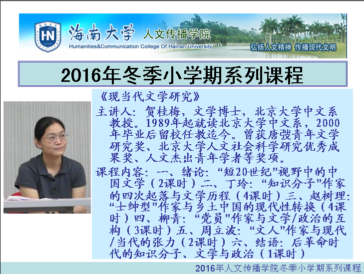 1月19日下午,贺桂梅老师结束了主题为“短二十世纪的文学与革命”的的小学期课程,期间,贺桂梅老师从四位作家(丁玲、周立波、赵树理、柳青)入手,从人的角度进入历史,带领在座同学与“短二十世纪”进行了一次深刻的对话,在回望革命岁月的同时,并力争重返、借鉴历史的经验与信仰。