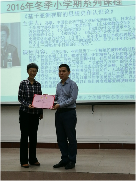 人文传播学院冬季小学期聘书”,并向同学们简单介绍了孙歌老师的情况。孙歌老师是中国社会科学院文学研究所研究员,日本东京都立大学法学部政治学博士。其主要著作有《文学的位置》、《主体弥散的空间》、《竹内好的悖论》、《我们为什么要谈东亚》等。孙歌老师多年来从事日本政治思想史研究,致力于推动东亚地区知识分子的深度对话。