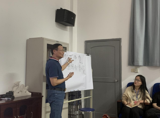 2017级汉语言文学专业一班的七组实习同学做完第一阶段实习汇报后,海口景山学校海甸分校刑益宝校长用演示法和比较法对学生汇报课件进行点评与修改,提醒各位同学应该注意以读带讲,从“写”练手,以为“做”而看为学习标准,注重锻炼自我表达能力,启发同学们学会发现和思考教学方法,注重向所在班级的班主任学习。