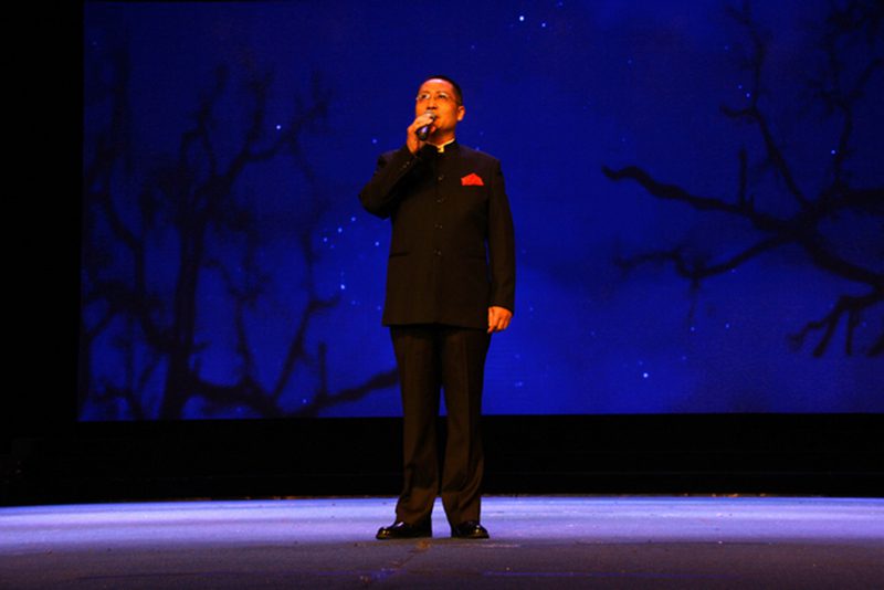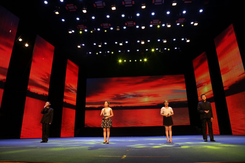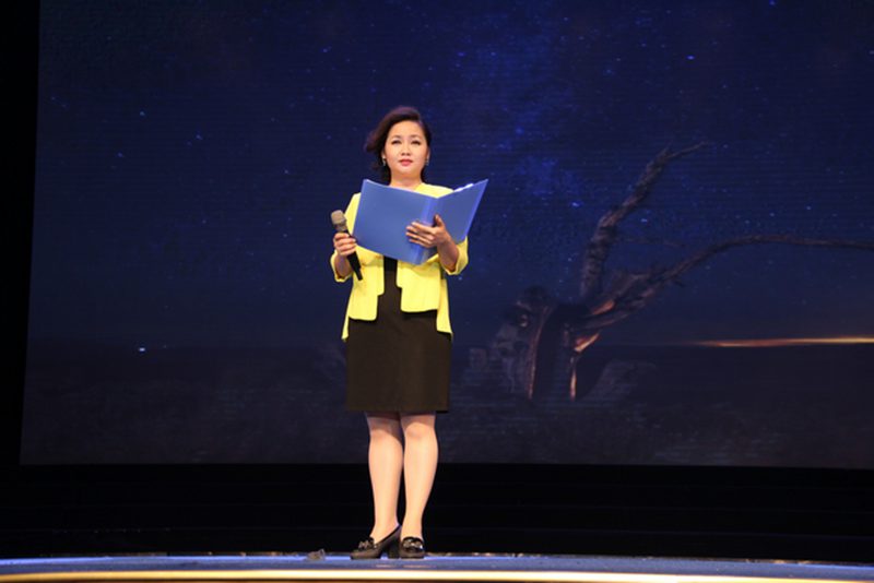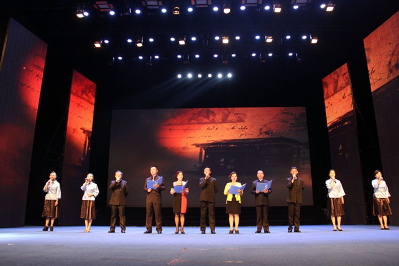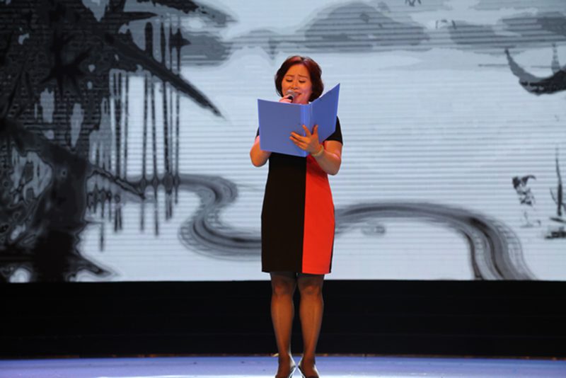人文传播学院濮钰晴同学合作主持。 本场朗诵会共分为“诗意中国”、“苦难再生”、“民族复兴”三个篇章。晚会在人文传播学院选送的《诗意中国》中正式拉开序幕,首篇“诗意中国”环节选取了中国古典文化中传颂不朽的宋代诗人苏轼的《水调歌头?明月几时有》、唐代诗人张若虚的《春江花月夜》和明代作家张岱的《湖心亭看雪》等五篇诗文名作,朗诵慷慨激昂或婉约凄美、跌宕起伏,流露出绵绵深情,似与物、与景融为一体,幻化成丝丝细雨,敲打着聆听者的心扉。第二篇“苦难再生”章节选取戴望舒《我用残损的手掌》、艾青《太阳》、韩少功《万泉河雨季》、毛泽东《沁园春?雪》等五篇现代诗文,诵读者以专业的朗诵技巧与多年的播音功底,结合对诗歌美的领悟,饱含深情,感人至深。黄晓宁老师的细而不腻、罗大明老师的铿锵激越以及邢月老师的温厚柔曼,让听者也为之动容。朗诵会第三篇为“民族复兴”篇章,选取了食指《相信未来》、唐昕《中国最高爱情方式》、张承志《海上的棋盘》等六篇诗文,听众们在“用美丽的雪花写下:相信未来”的语句中燃起希望,在“爱了六十年没说过一句话”的诗句中体悟“中国最高形式的爱情”。第三篇章以梁启超的《少年中国说》收场,全体诵读者气势慷慨、意气风发,朗诵会在“少年强则中国强”铿锵之音的回荡中完美落幕。 此次朗诵会诵读者为海南省朗诵家罗大明,主任播音员、国家级普通话水平测试员邢月,海南软件职业技术学院教师、主持人黄晓宁,海南广播电视总台海南新闻联播节目主持人罗哲,海南新闻主播王一宁以及灵犀直播