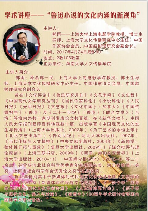 2017年4月24日晚上8点,上海大学上海电影学院教授,博士生导师,上海大学文化传播研究中心主任郝雨教授在我校2教106教室为灵犀直播