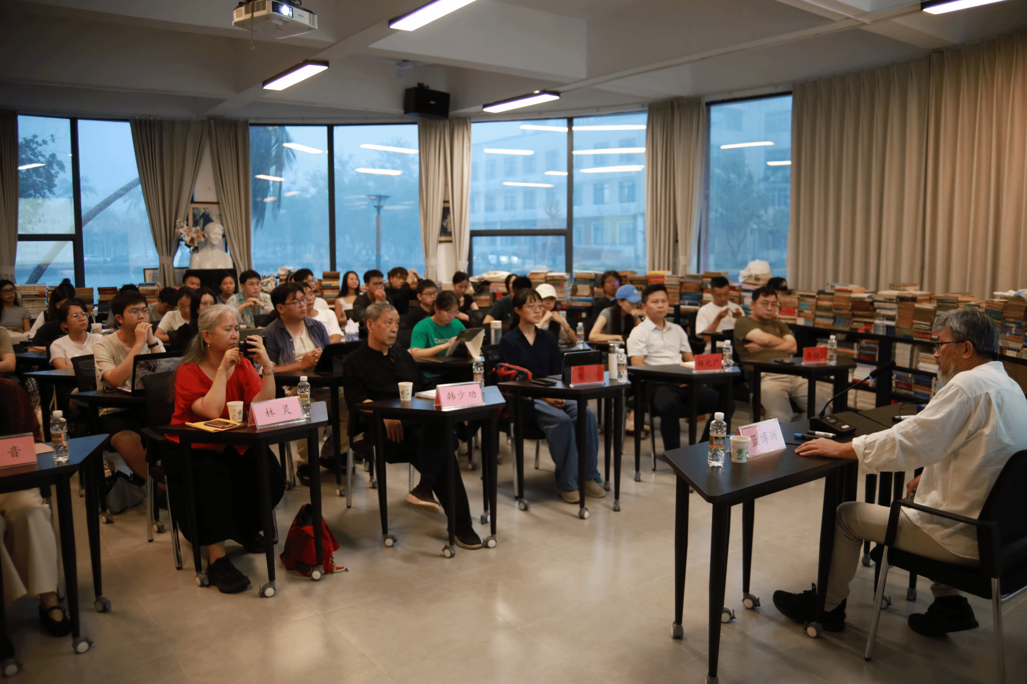 近百位海大师生认真聆听蓝博洲与韩少功对谈,并与蓝博洲进行热烈交流。