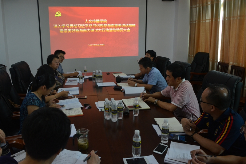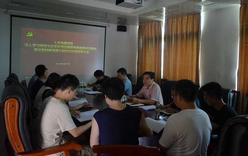 6月29日下午,人文传播学院召开深入学习贯彻习近平总书记视察海南重要讲话精神建设美好新海南“大研讨大行动”活动动员部署会,会议由学院党委书记华世佳主持,院长刘复生,副院长石晓岩、张硕果等学院理论学习中心组成员以及各系系主任参加了会议。与会人员共同学习了习近平总书记视察海南重要讲话精神和省委书记刘赐贵在省第七次党代会上的报告,会议对学院“大研讨大行动”活动做出工作部署。