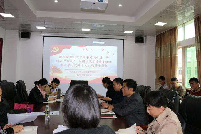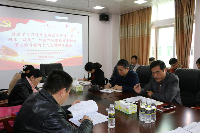 12月26日下午,人文传播学院教工第一、第二党支部在社科楼B615联合召开传达学习贯彻落实习近平总书记关于进一步纠正“四风”加强作风建设重要批示 深入学习党的十九大精神专题会,会议由教工第一党支部书记李音主持。 会议第一阶段,院党委书记华世佳、副书记孙晓嫒分别作学习党的十九大精神的主题发言,随后教工第二党支部书记何晶娇、支部成员海滨、支部书记李音也分别从不同的角度畅谈自己学习党的十九大精神的收获与体会。大家纷纷表示,学习党的十九大精神不能放松,不仅要学习理论知识,更要用理论指导实践,使其贯穿于具体的工作中,推动各项事业的发展。 会议第二阶段,全体党员集体学习了新华社12月11日刊发文章《习近平批示后,中纪委再揭“四风”15个新表现》,了解了“四风”问题的各种新表现,领会了反“四风”的重要意义,知悉了在习近平总书记领导下党中央采取的一系列重要举措,更加坚定了党员同志们的共产主义理想信念,更加明确了“四个意识”,同时也纷纷表示党员就应该以身作则,坚决同腐化堕落的倾向和行为作斗争,牢固树立为人民服务的根本宗旨。 最后,会议要求每一位党员对照“四风”新表现规范自己的言行,并且在具体工作中对照查找自身问题,改进工作方式方法,切实发挥党员的先锋模范作用。//www.lingxilive.net