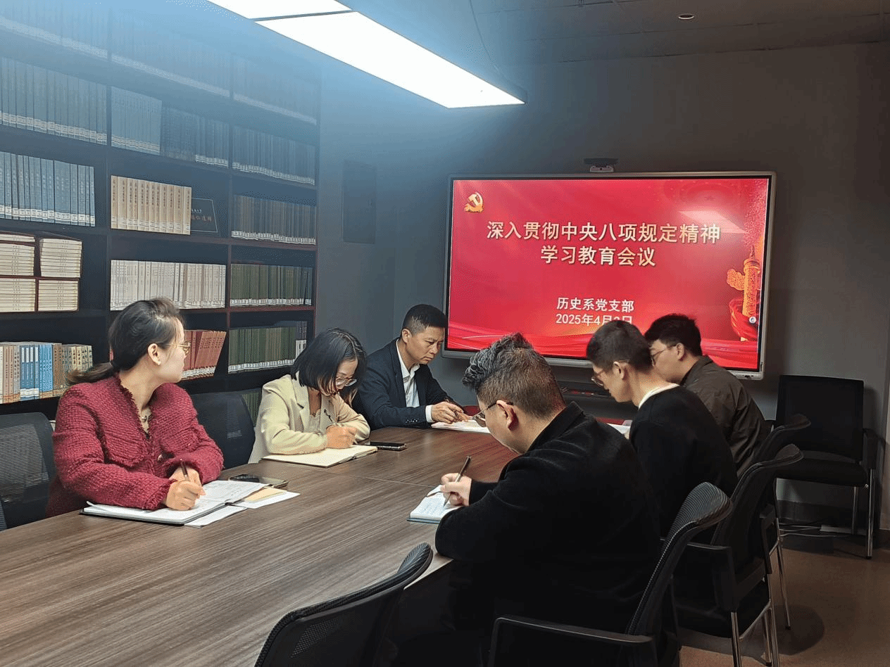 历史系党支部在社科楼B621会议室召开深入贯彻中央八项规定精神学习教育会议,全体党员参加会议。
