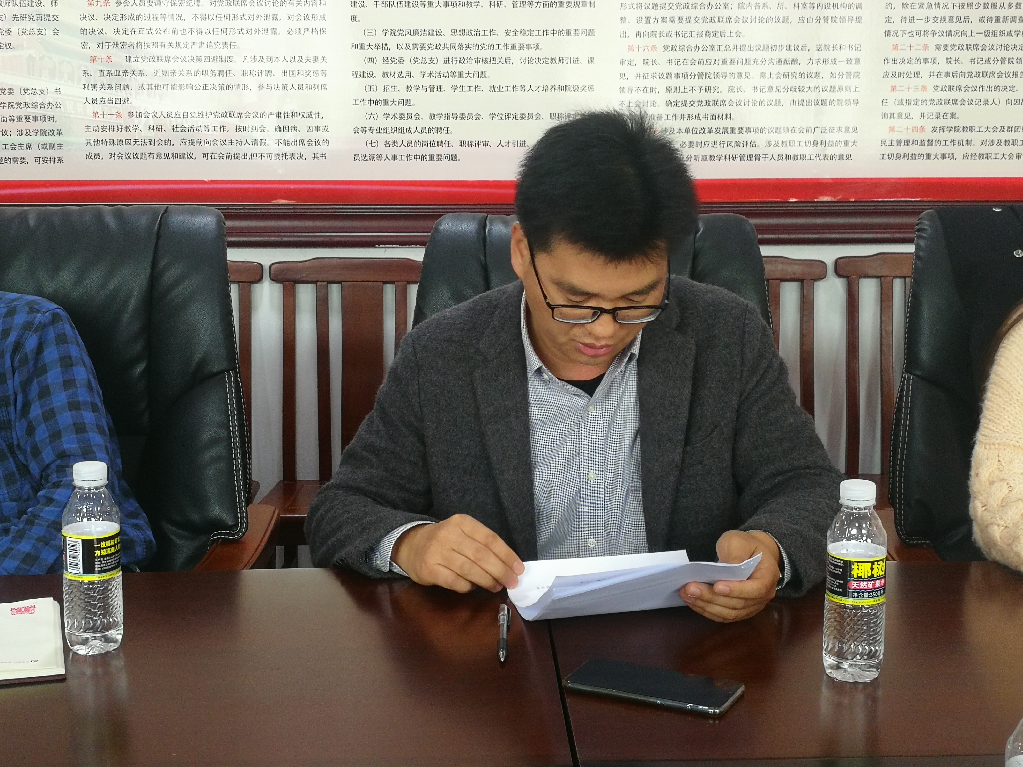 会上,华世佳传达了学校党委组织部关于开展基层党组织书记抓党建工作述职的通知精神和要求。随后各党支部书记分别进行述职发言,主要按照成绩清单、存在问题、整改措施三个方面对自己履行职责情况进行了认真回顾总结,对支部工作中存在的问题进行了认真的剖析,对2019年支部党建工作进行了安排部署。根据各个支部书记的工作情况,学院党委书记、副书记及党委委员本着客观公正、实事求是的原则,对述职的支部书记工作进行了民主测评。