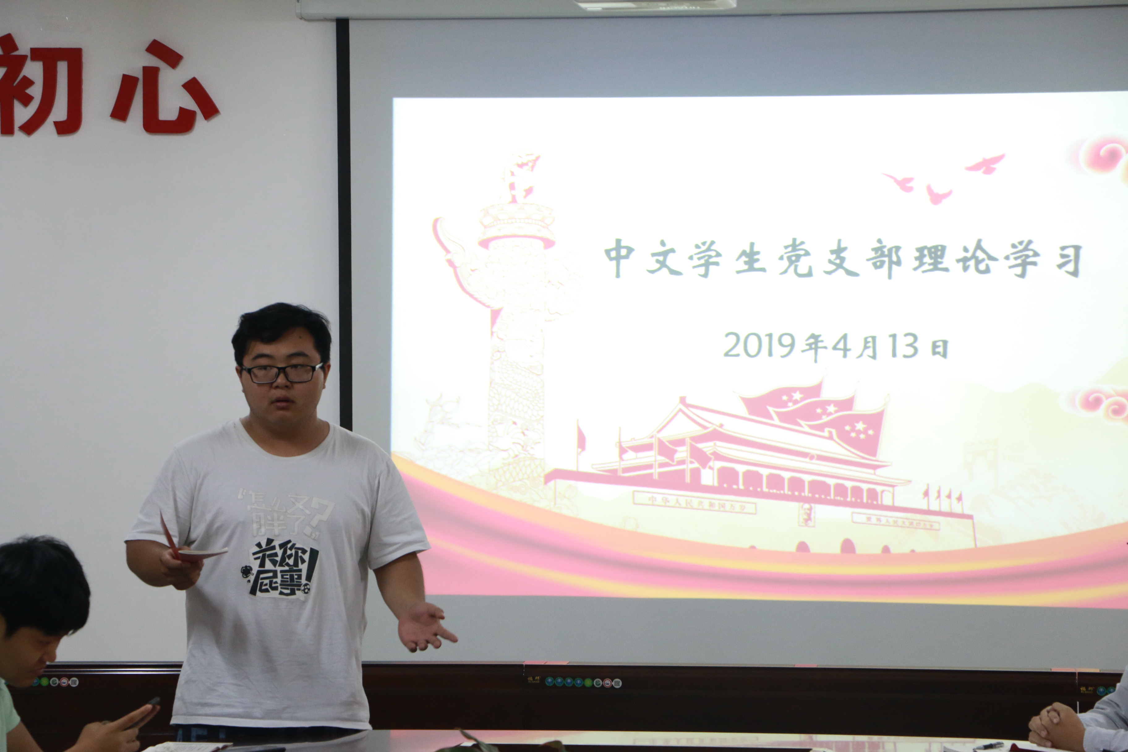 4月13日上午,理论宣讲进支部活动第一期走进中文学生党支部在社科楼B719举行,宣讲会由中文学生党支部书记熊文军主持,中文学生党支部全体学生党员、入党积极分子及学“习”宣讲团等有关同志参加会议。