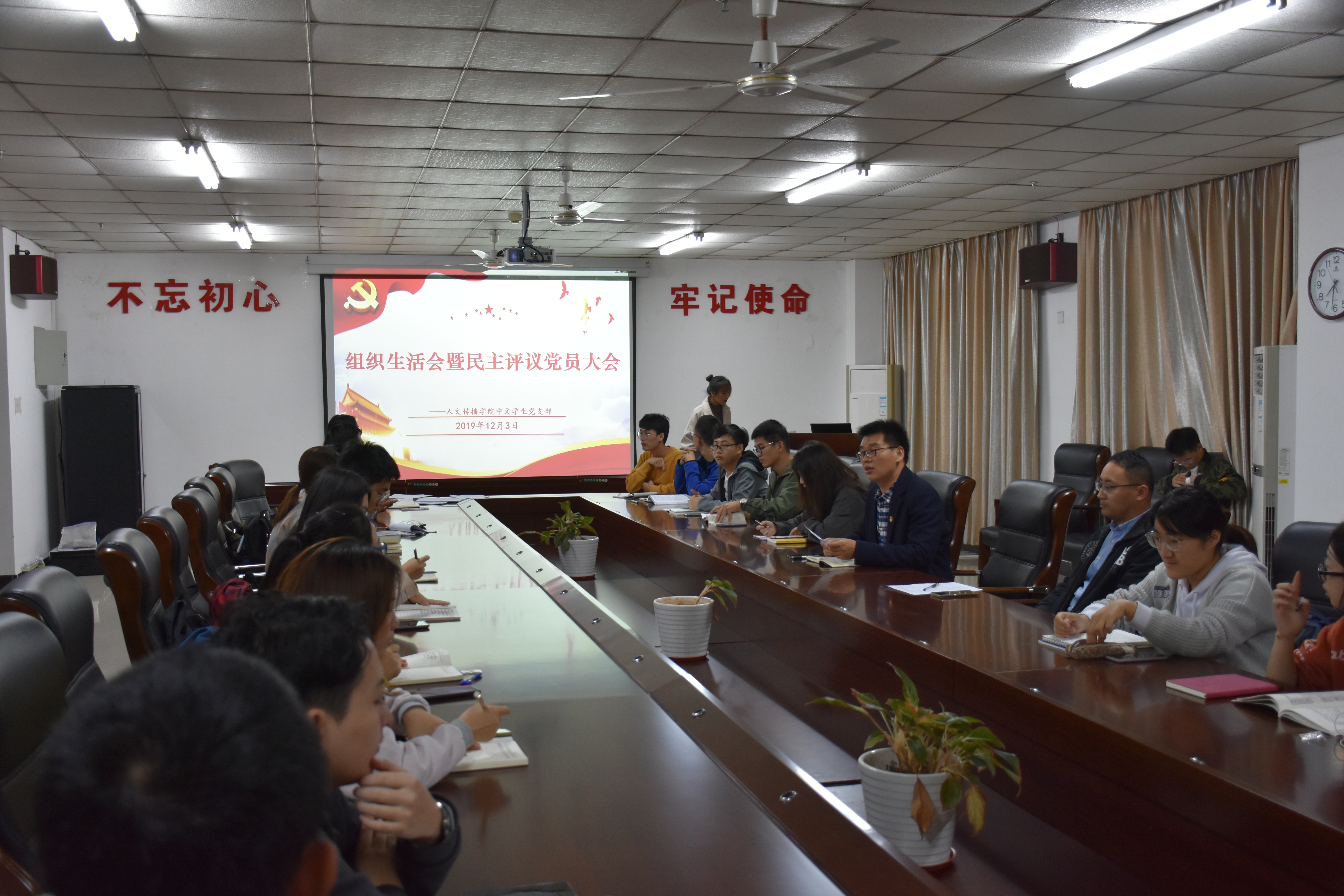 为贯彻落实“不忘初心、牢记使命”,不断提高党员的自我净化与自我完善能力,人文传播学院中文学生党支部于2019年12月3日晚19:30在社科楼b719召开组织生活会,学院党委委员公衍峰老师受邀出席,全体党员、预备党员与三名群众代表参与此次会议。
