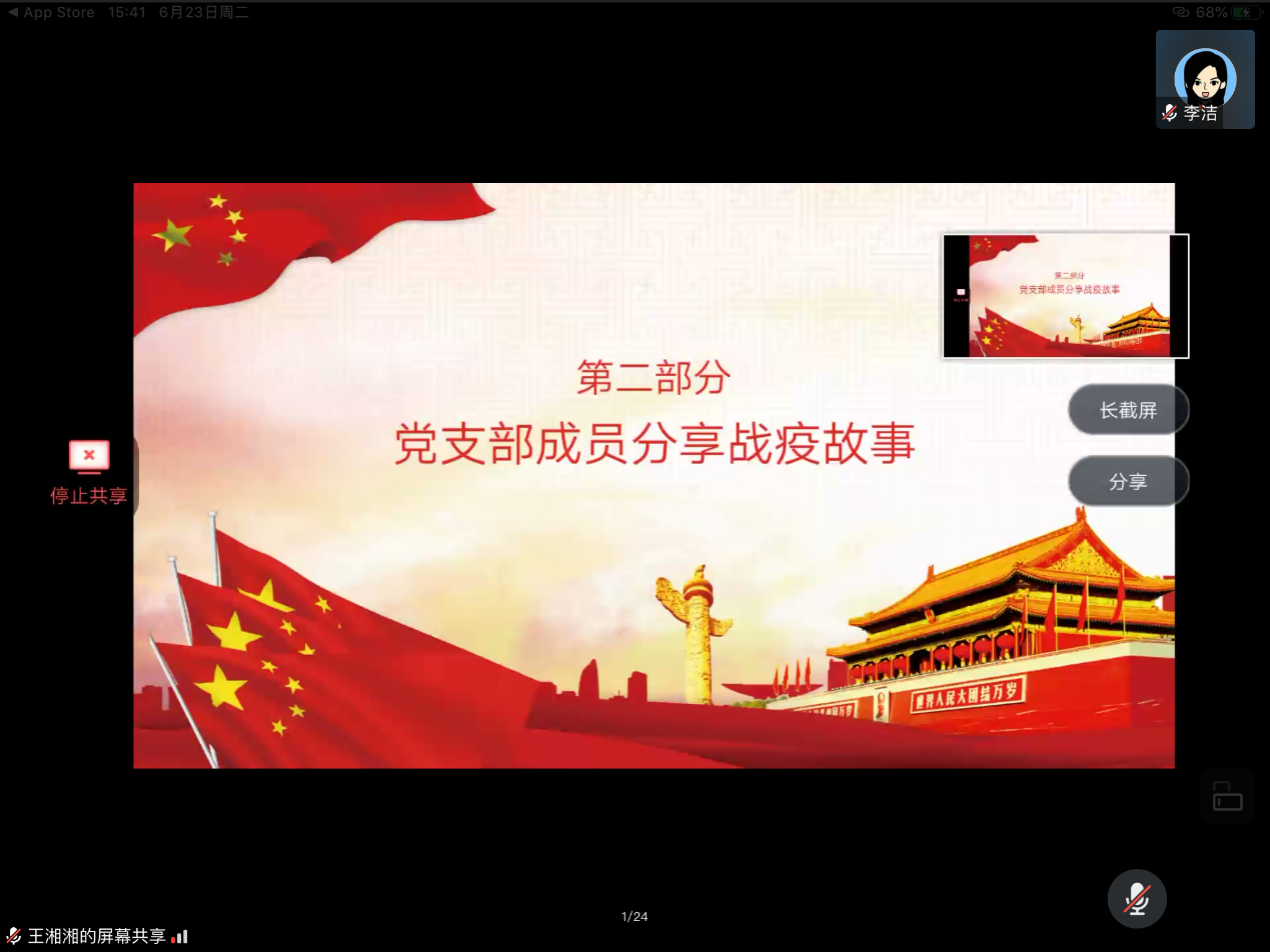 会议第一项是支部书记上微党课,党课主题是“让党旗在防控疫情斗争第一线高高飘扬”。支部书记李洁老师通过分享灵犀直播