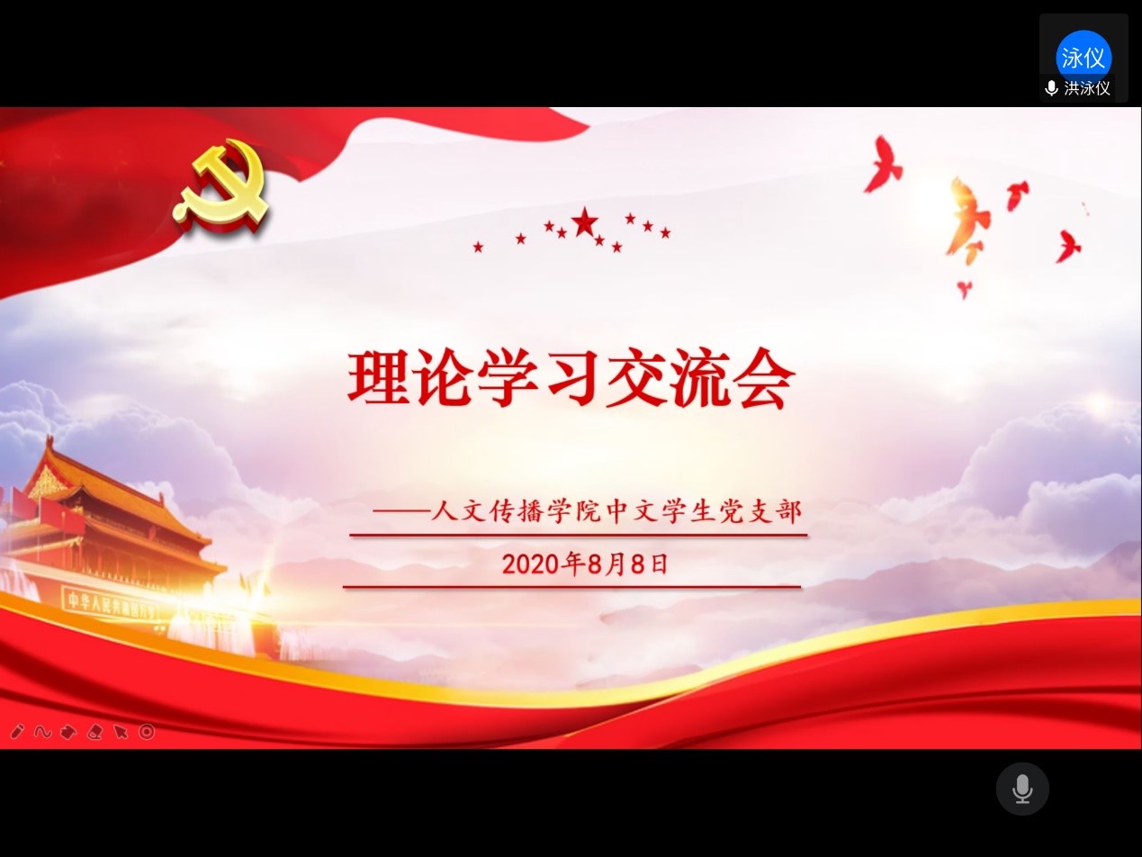 为深入学习贯彻落实习近平新时代中国特色社会主义思想和党的十九大精神,推进组织生活规范化常态化,中文学生党支部于2020年8月8日通过线上召开理论学习交流会,会议围绕学习文件精神以及党员分享交流两方面开展,由高闻同志主持,支部全体党员同志参与。