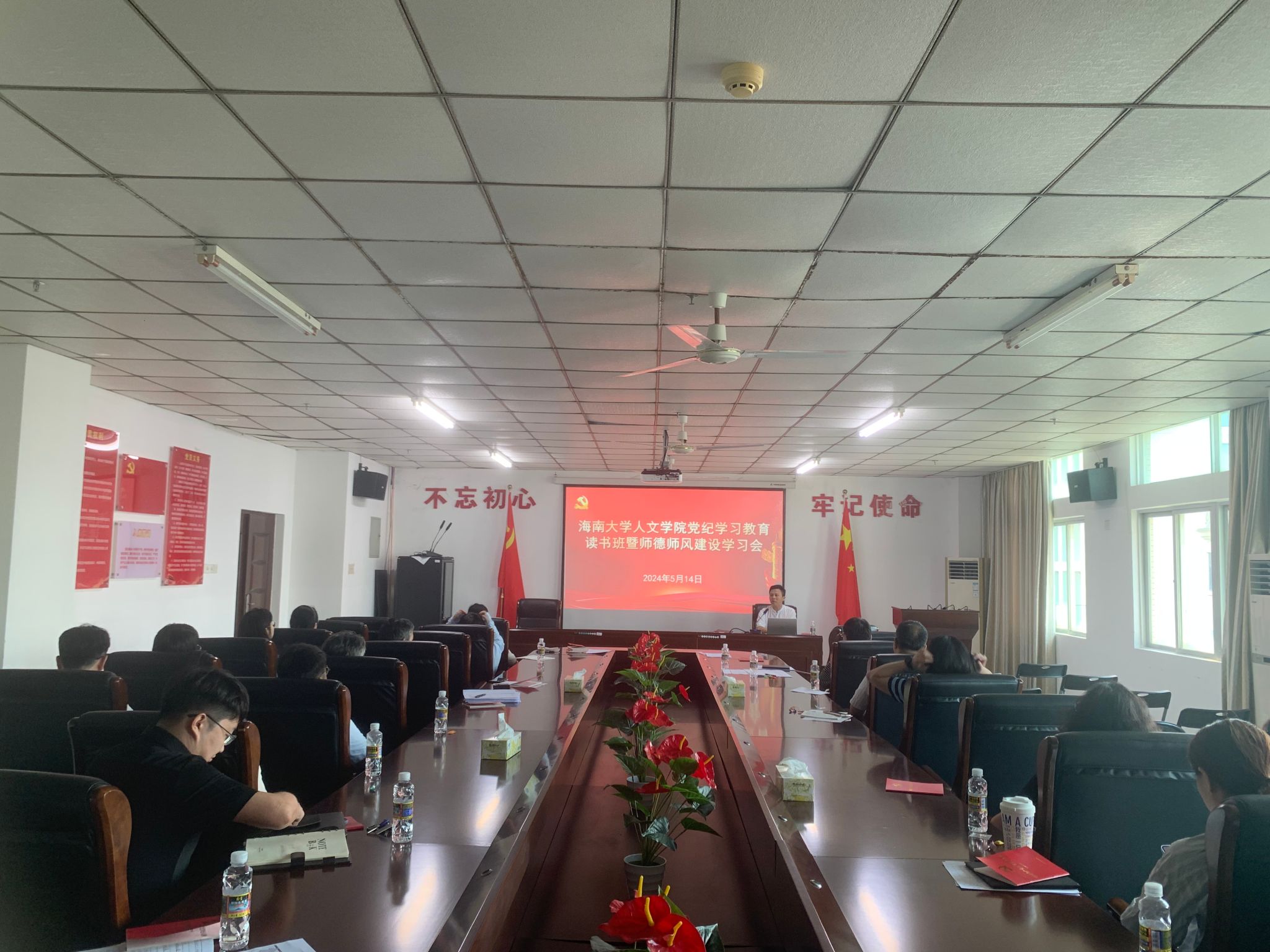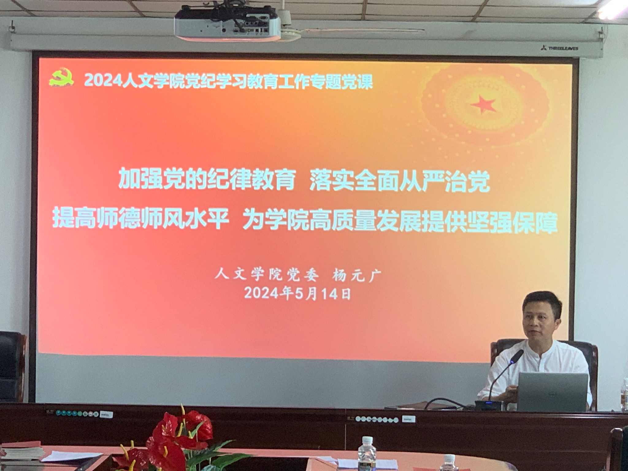 党委书记杨元广在社科楼会议室B719主持召开党委理论学习中心组(扩大)学习会议——党纪学习教育读书班暨师德师风建设学习会。学院院领导、党委委员、系主任、教研室主任、办公室主任和全体党员等参加会议。