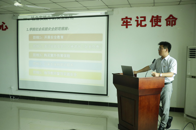 在安全教育环节,熊文军老师围绕暑期社会实践常见的交通安全、投宿安全、财产安全、饮食安全等八个方面安全隐患并结合实际案例,有针对性地向本年度参与社会实践的重点团队负责人提出了预防与解决措施。然后,熊老师就现阶段同学们对实践普遍存在的迷惑做出了解答。通过老师的具体宣讲,同学们对安全防范有了深刻的认识。在安全宣讲后,熊文军老师还从社会实践中的交际礼仪和新闻宣传工作做了分享指导,动员各重点团队在暑期社会实践中做好计划,扎实推进实践活动的开展。团委社会实践部马昱含同学在动员会上向各重点团队负责人说明了暑期社会实践具体注意事项。下午5点整,此次会议结束,全体与会成员前往指定地点作出征合影留念。