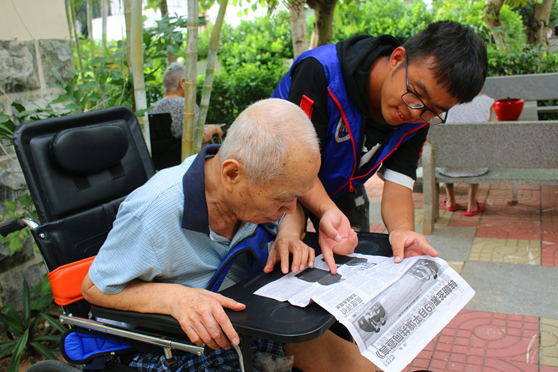 志愿者陪老人阅读报纸