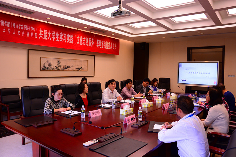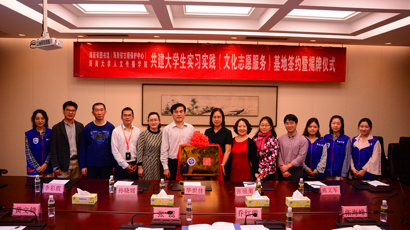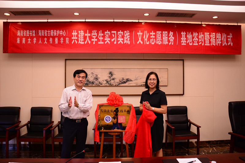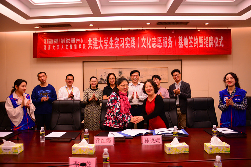 2018年11月30日,人文传播学院与海南省图书馆(海南省古籍保护中心)深化共建大学生实习实践基地签约揭牌仪式在海南省图书馆成功举行。人文传播学院党委书记华世佳,海南省图书馆副馆长张蕊,人文传播学院党委副书记孙晓媛,副院长张硕果、李彩霞,古籍保护中心办公室主任乔红霞等出席签约揭牌仪式,部分基地实践志愿者也参与了签约揭牌仪式。双方就开展实习实践基地共建工作,合作发展学生实践实习工作展开交流。签约揭牌仪式由海南省古籍保护中心办公室主任乔红霞主持。