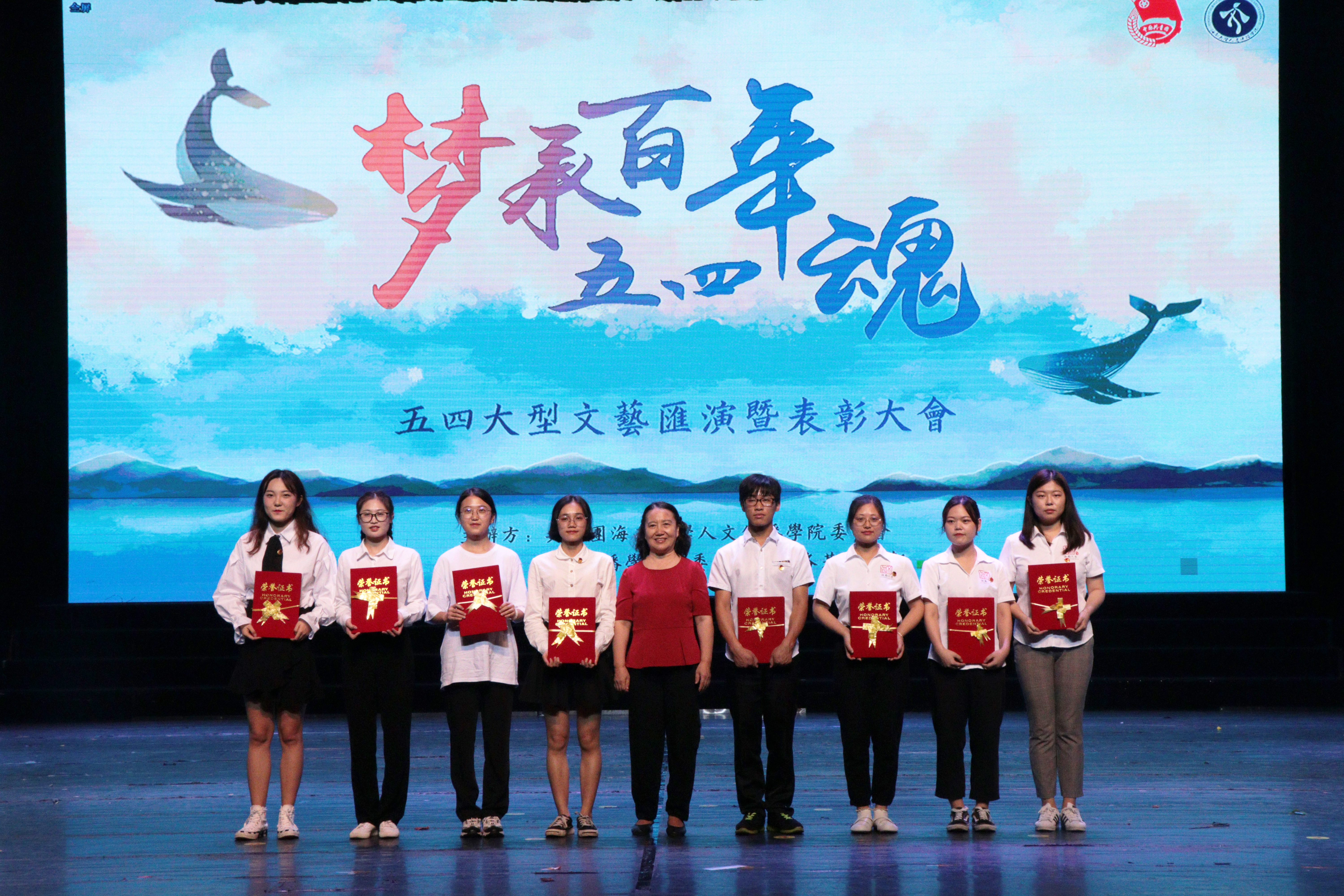 伴随着团学青成员带来的《青年阵线联盟》,本次汇演比赛表演环节圆满结束。在评委们公平、公正的评分下,比赛结果在现场观众的期待下揭晓。17新传队以本场最高分获得比赛一等奖。18中文2队,17中文队和17汉教队凭借着优异的成绩获得二等奖。17戏影队和18新传队收获三等奖。18戏影队,16中文队和18中文1队获得优秀奖。此外,通过“海大人文青年”微信平台进行的节目网络投票评选的“最具人气奖”由17戏影队获得。
