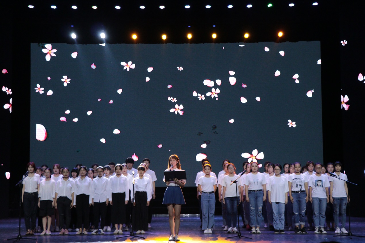 第三篇章“不负光景?姣姣花开正少年”中,16级中国语言文学类的同学们带来的朗诵《生如夏花》,充分彰显了新时代青年对祖国母亲的热爱。18级新闻传播学类的同学们带来的合唱《静悄悄的春风吹满地》,沁人心鼻的青春气息通过他们的歌舞淋漓尽致的展现在我们面前。17级汉语国际教育带来歌舞《青春正当时》,观众们伴着台上的歌声有节奏左右摇晃,轻声和唱。