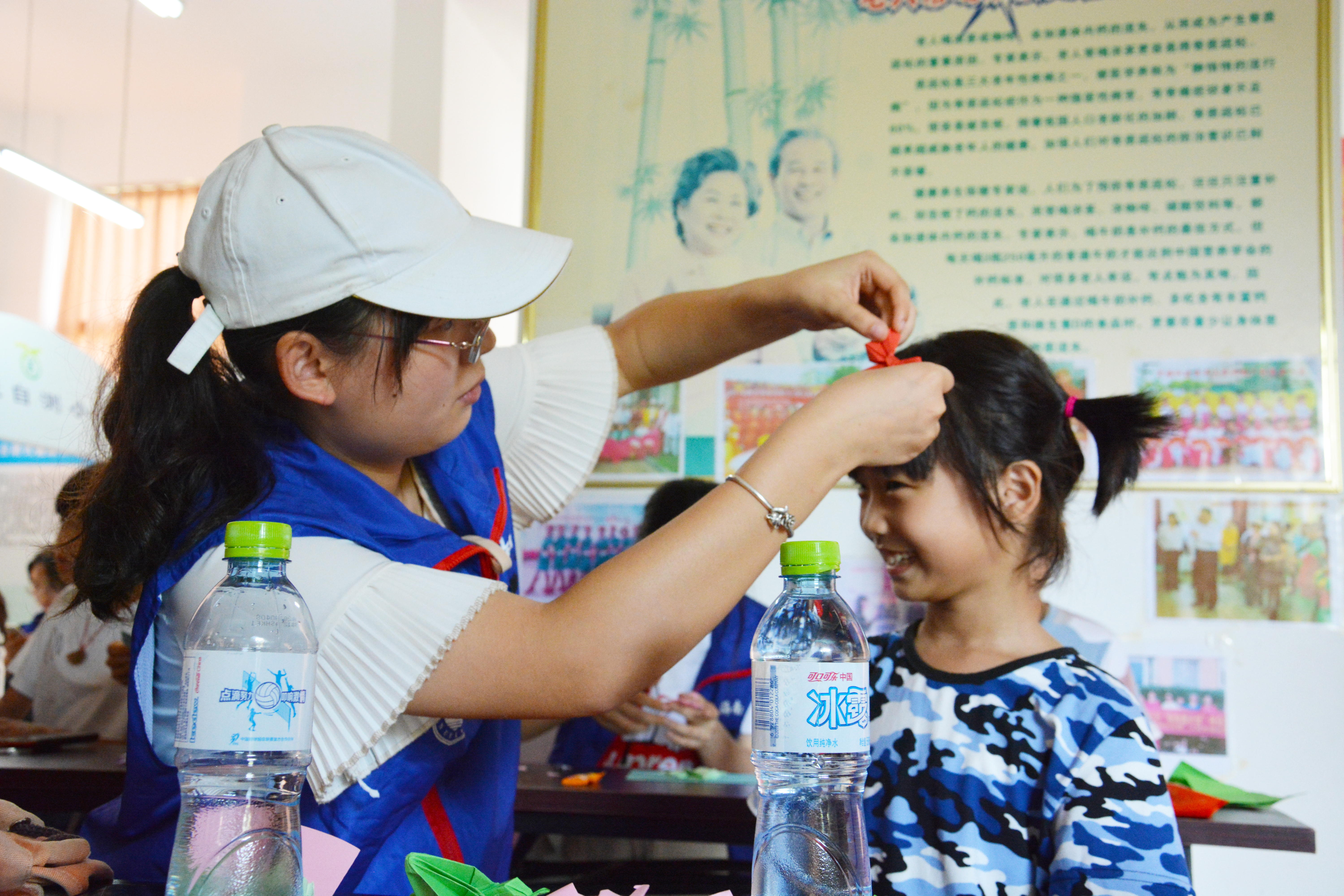 志愿者为孩子带上蝴蝶结