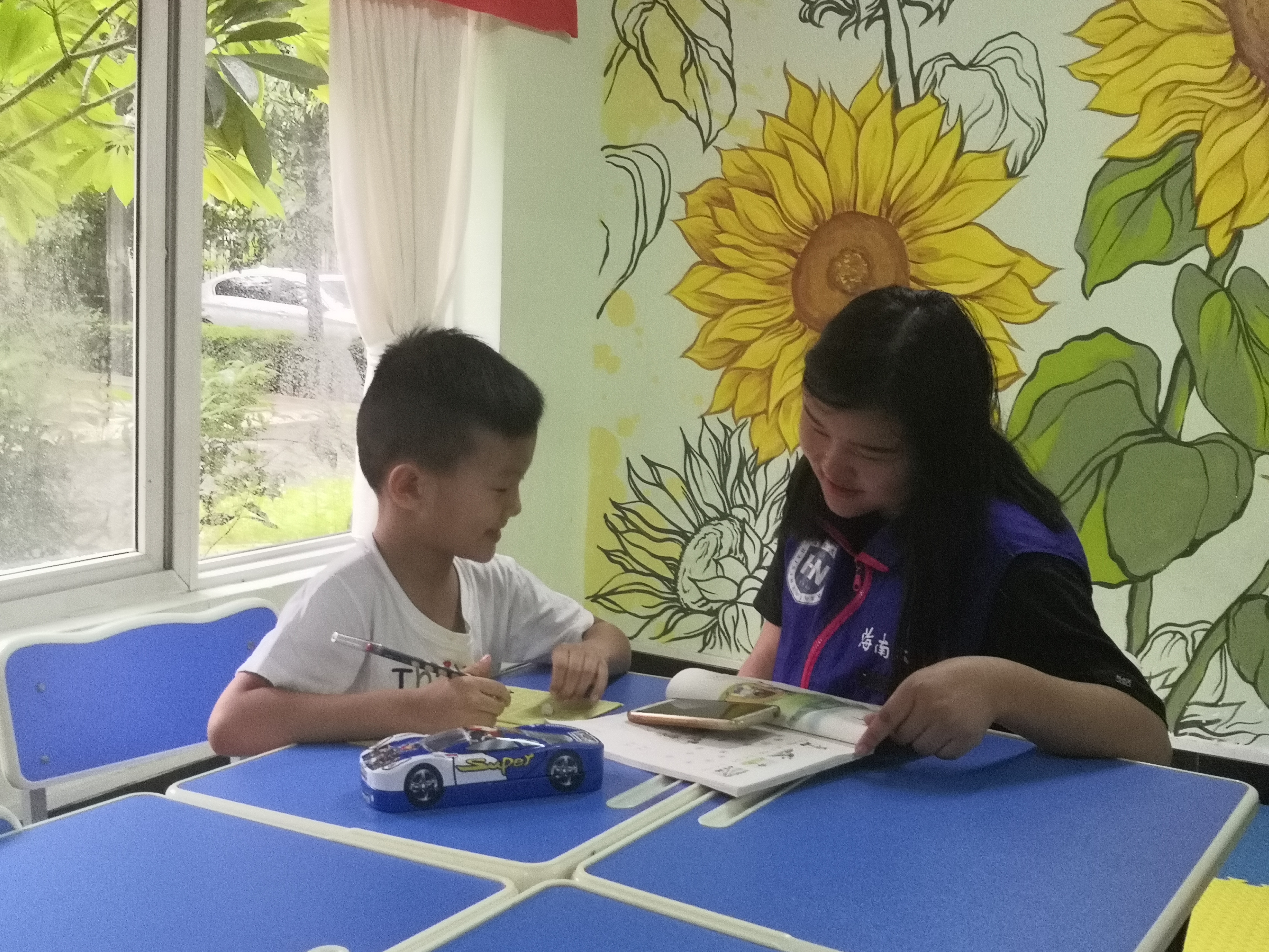 到达活动地点后,志愿者们自行分工,清扫场地、整理书架,统计书屋内近期收到的世纪海岸业主们捐赠的书籍信息并整理记录,合理的分工使得志愿者们的工作忙碌而有序。在阴雨天,书屋因孩子的到来而充满活力。待孩子到来后,志愿者们开始辅导孩子完成作业,教授拼音读法,耐心为孩子讲解题目、引导孩子自主学习,鼓励并督促孩子完成作业。孩子的笑声为本期活动画上了圆满的句号。在阵阵清凉的晚风中,本学期第一期“海岸风吹,童趣溯洄”世纪海岸义务帮教活动顺利结束。