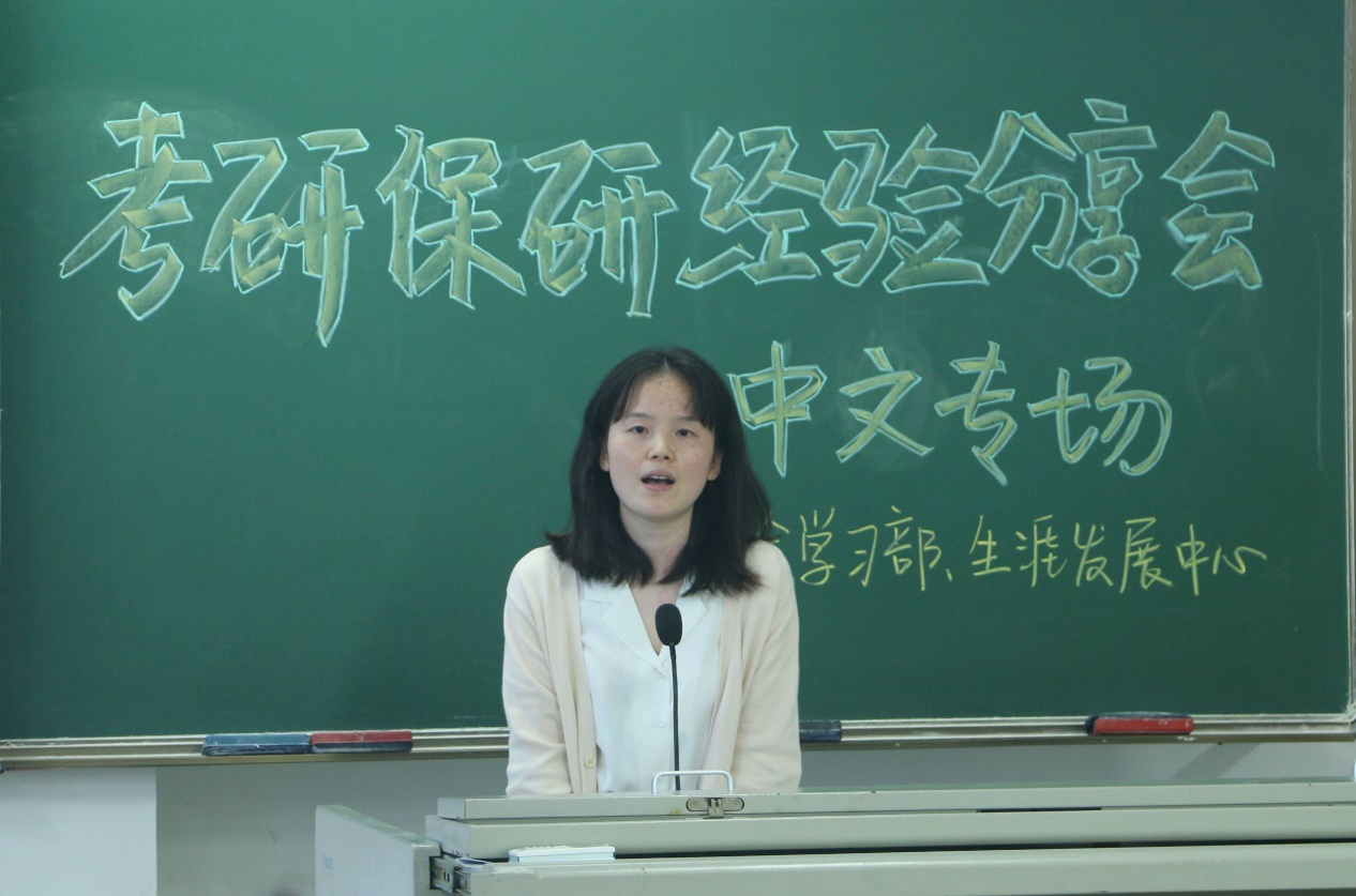 第二位是推免至南开大学汉语国际教育专业的徐丹平学姐。学姐对于保研的经验进行了详细的讲解。首先应该在心中明确自己想要去的大学,确定专业,以及研究生的方向。平时多看书积累素材,咨询相关专业的老师,尽量写出一篇优秀的论文,为保研增加筹码。她讲话围绕了两个主题:学习和真诚。单纯的过好每一天,单纯的学习,也许这种单纯就是学姐能够保研成功的原因。