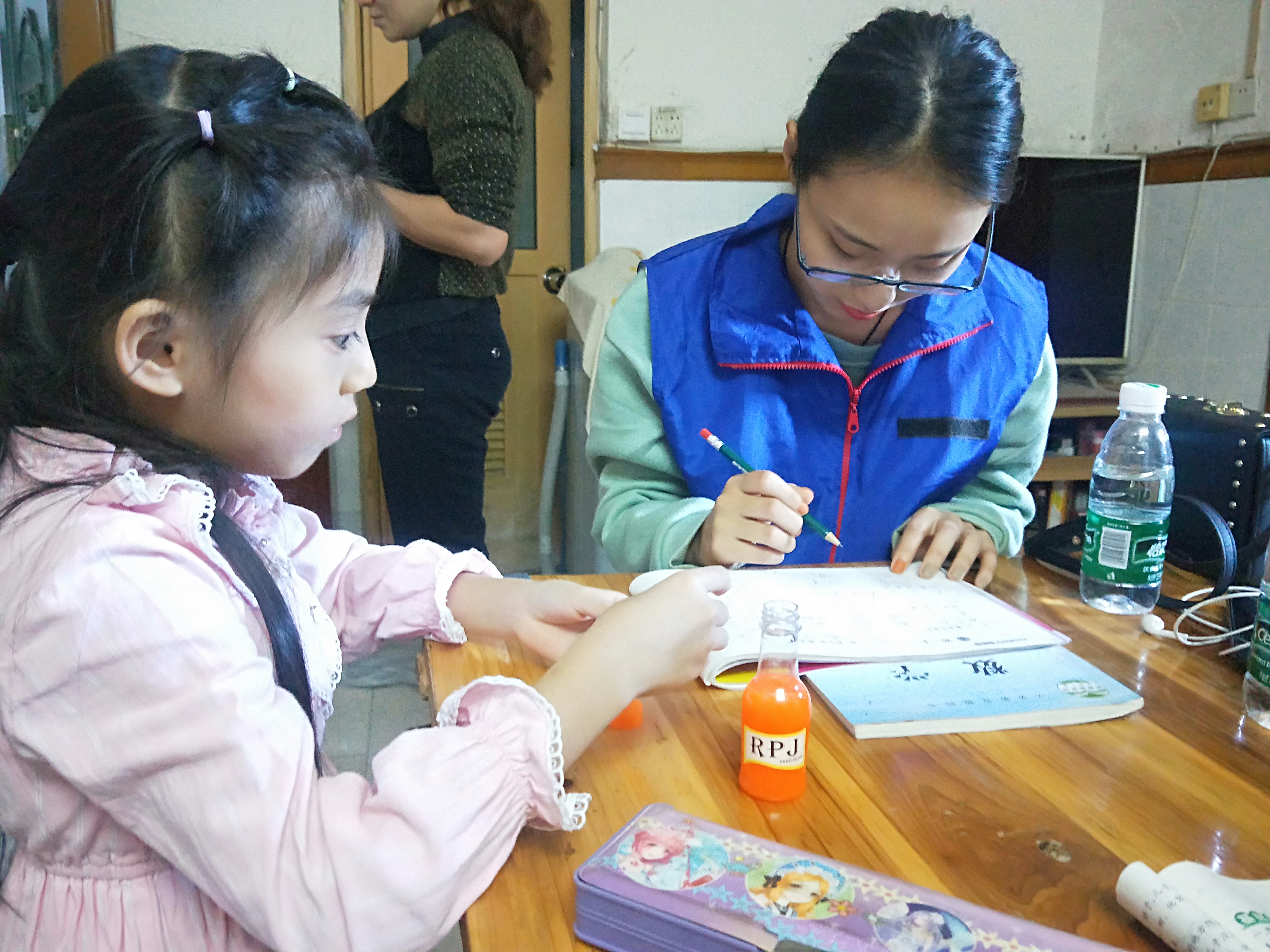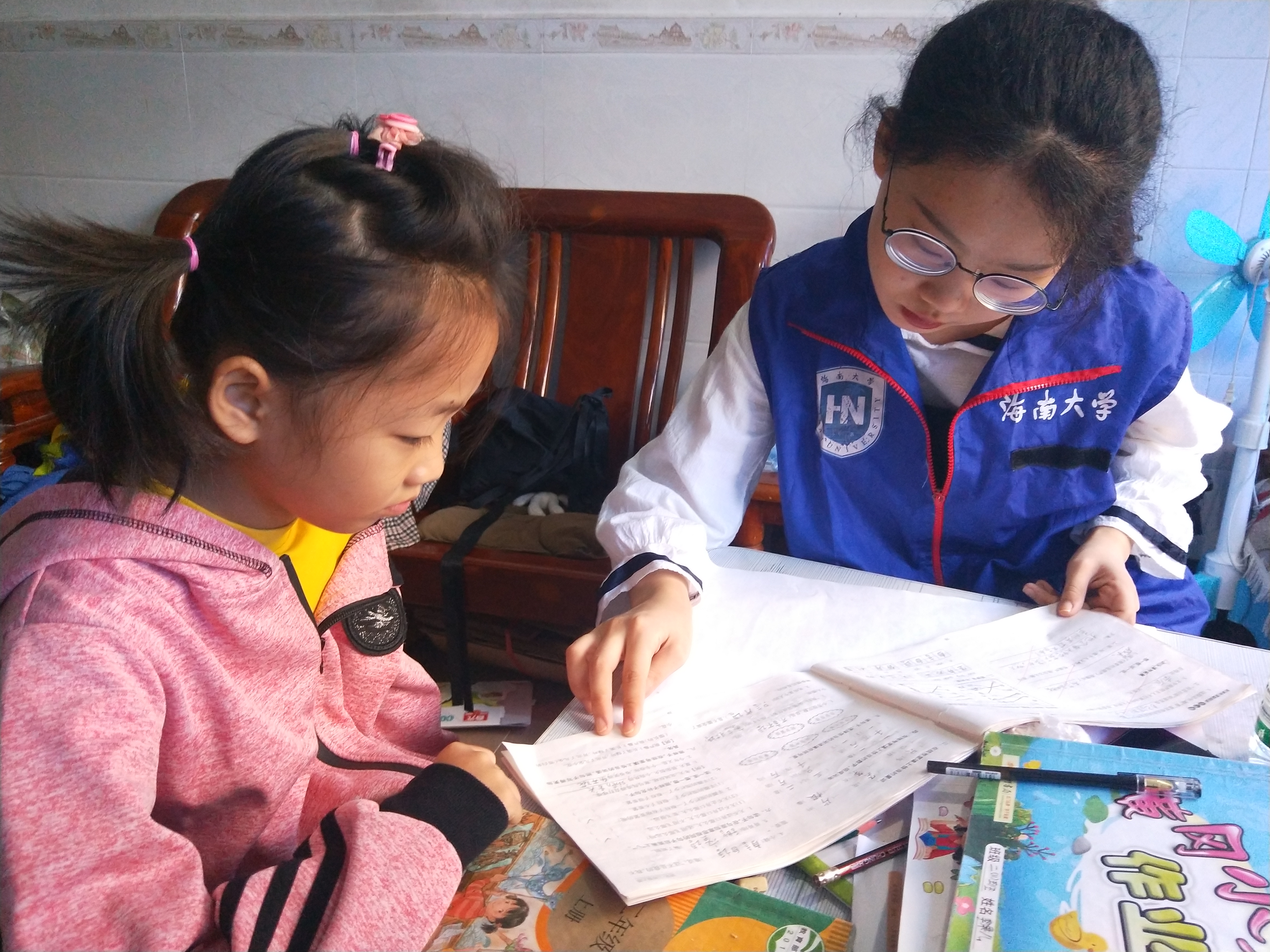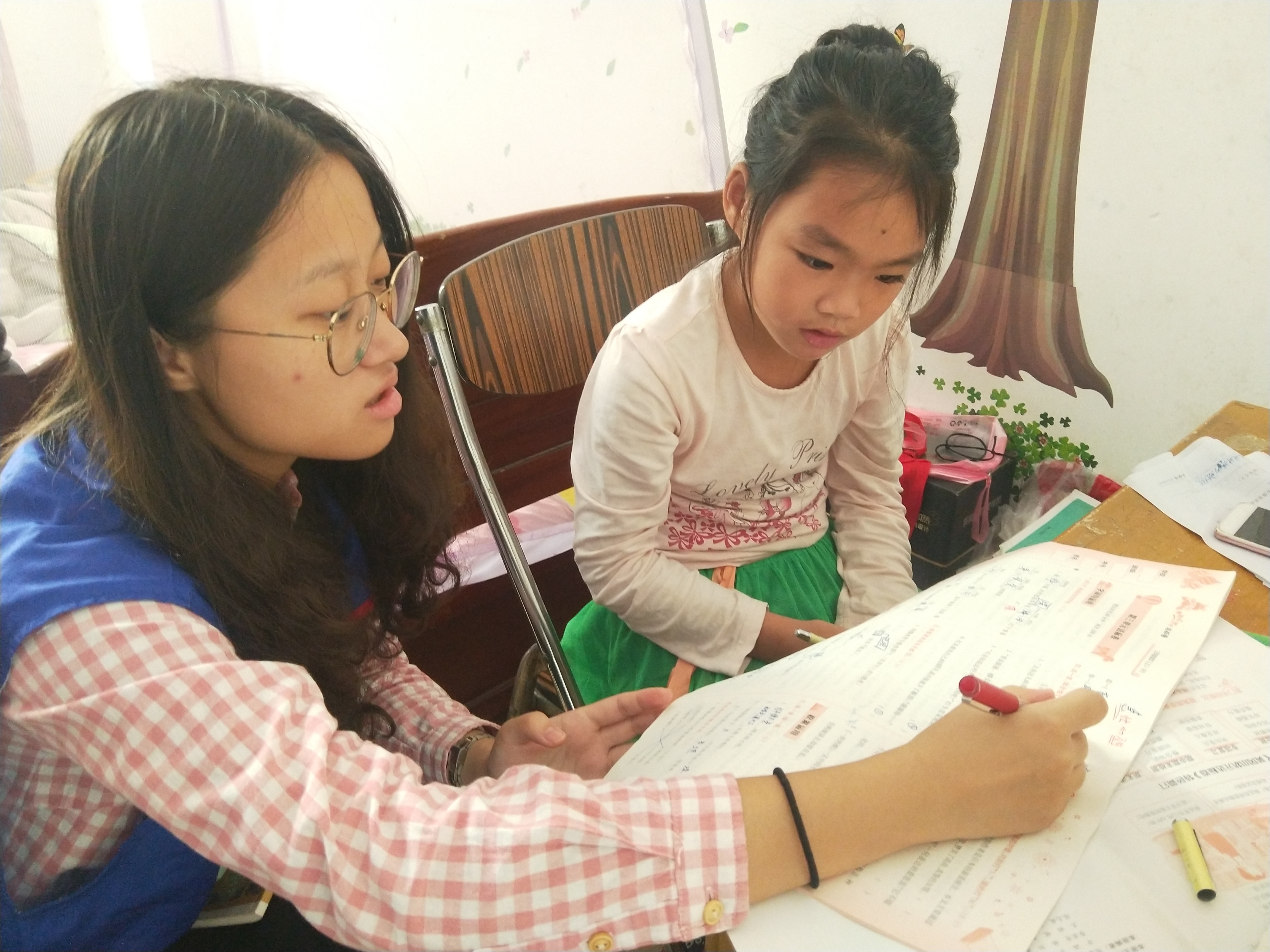 志愿者为孩子检查作业