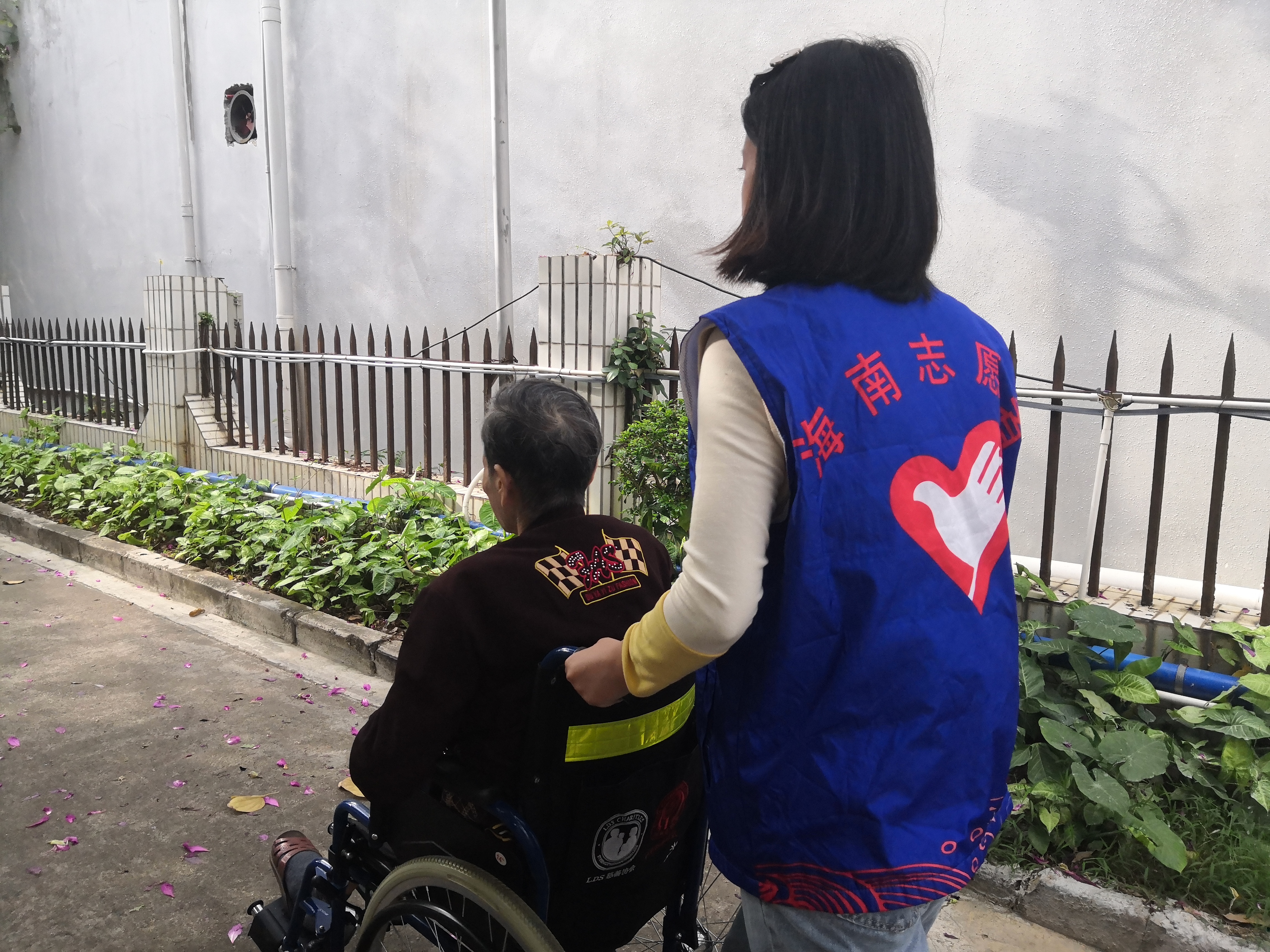志愿者带老人散步