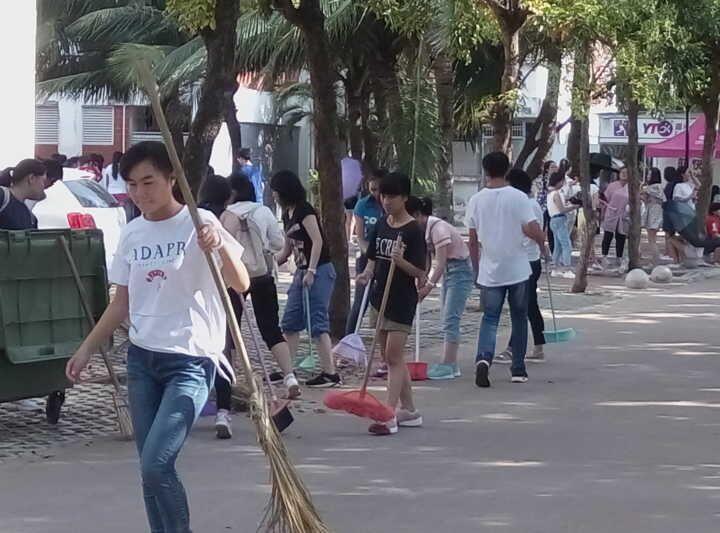 城西校区开展了校园清扫志愿服务活动。来自人文传播学院2016级新生8个班级中的近百名志愿者,参加了此次志愿清扫活动。 活动开始时,各班志愿者在灵犀直播