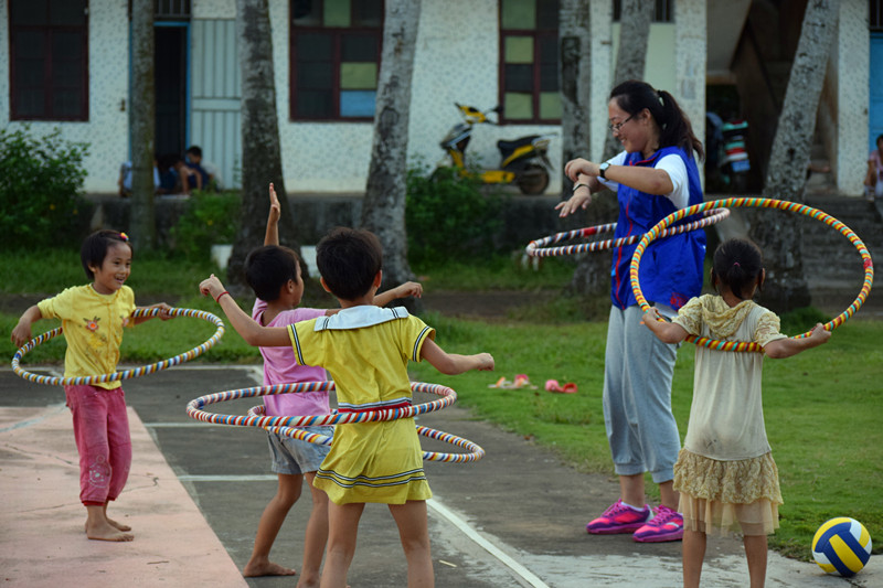 志愿者与小朋友一起玩呼啦圈
