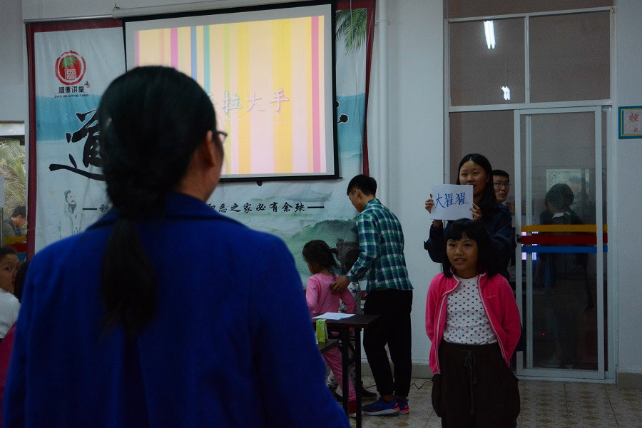志愿者和孩子们一起学习书法