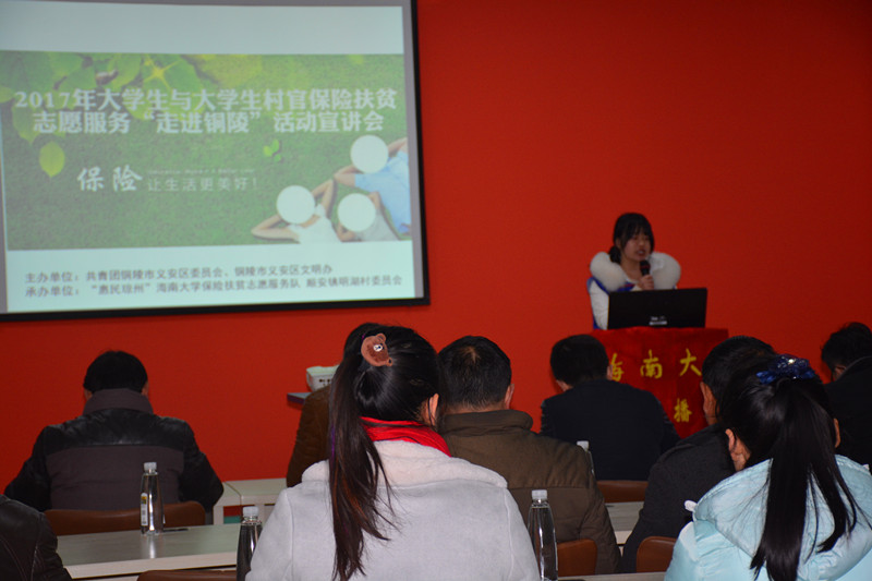 “惠民琼州”保险扶贫志愿服务团走进安徽铜陵,开展2017年大学生与大学生村官保险扶贫志愿服务活动。活动在铜陵顺安镇明湖村举行,共青团义安区委、铜陵国元保险公司及镇村主要负责人也参加了活动。